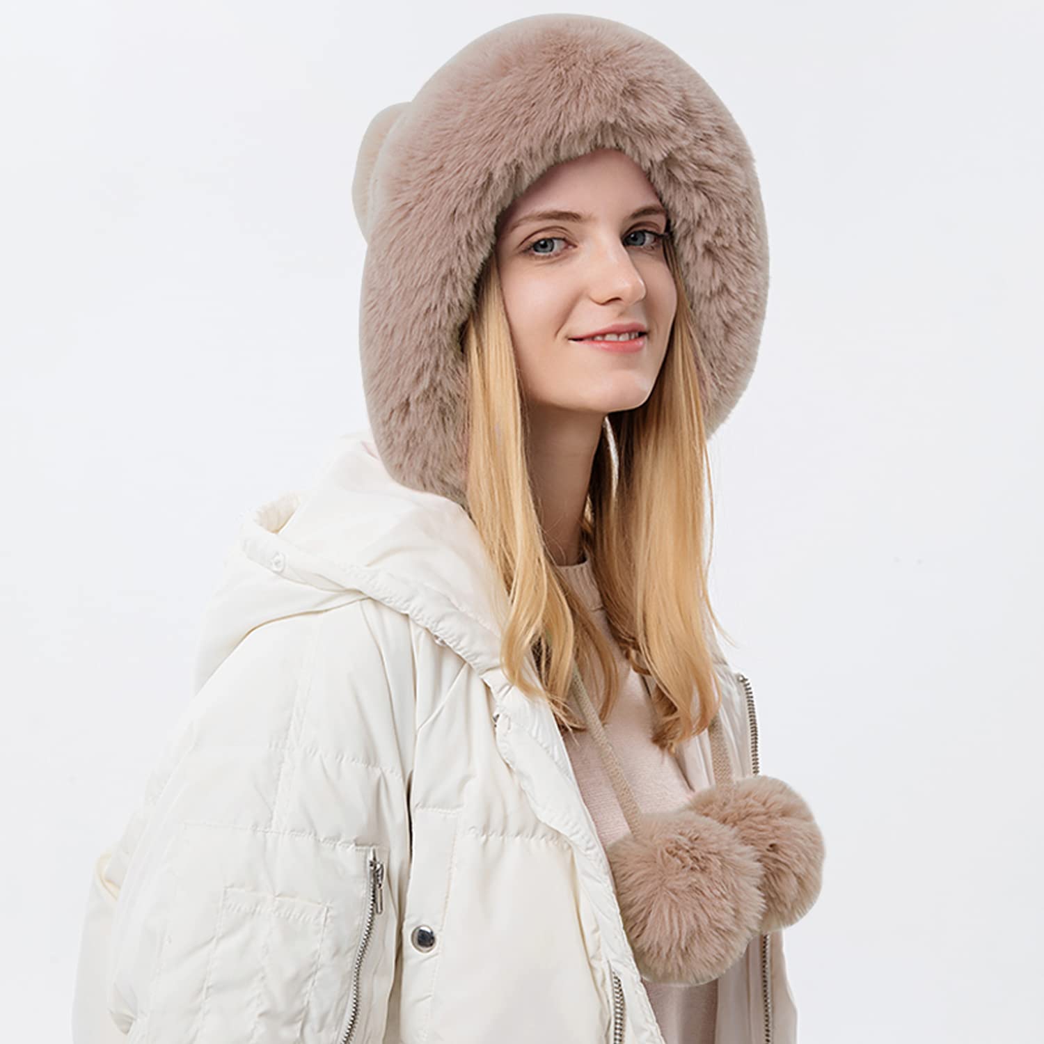 Dawfold Women Knit Beanies Hats Winter Peruvian Cover Ears Faux Fur Crochet Skull Cap with Pompom Fluffy Fleece Lined Khaki