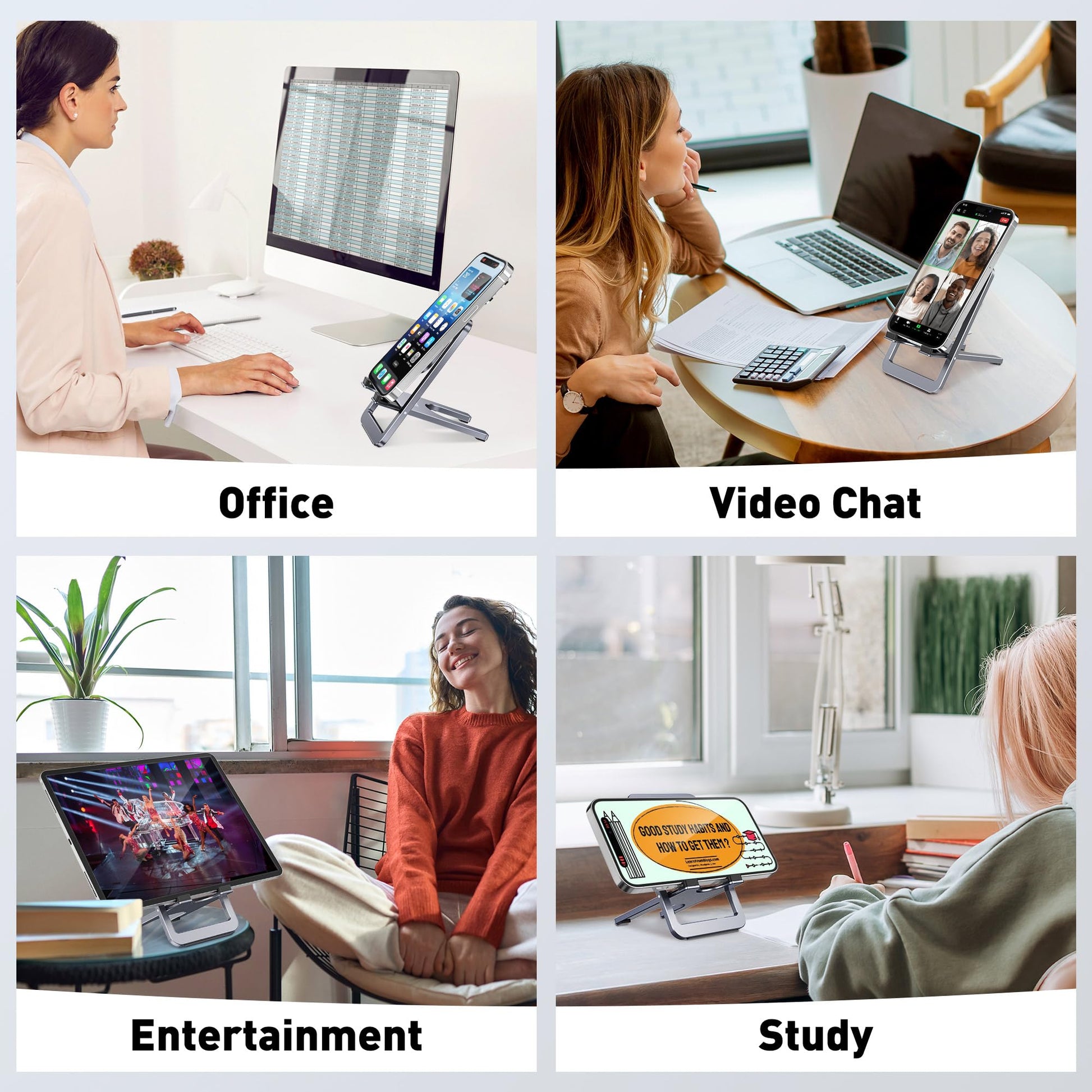 - Ultimate Convenience On-the-Go: Experience the portability of our foldable aluminum desktop phone stand. Designed for travelers and professionals alike, this pocket-sized phone stand lets you enjoy YouTube or Facetime, hands-free, wherever you are.