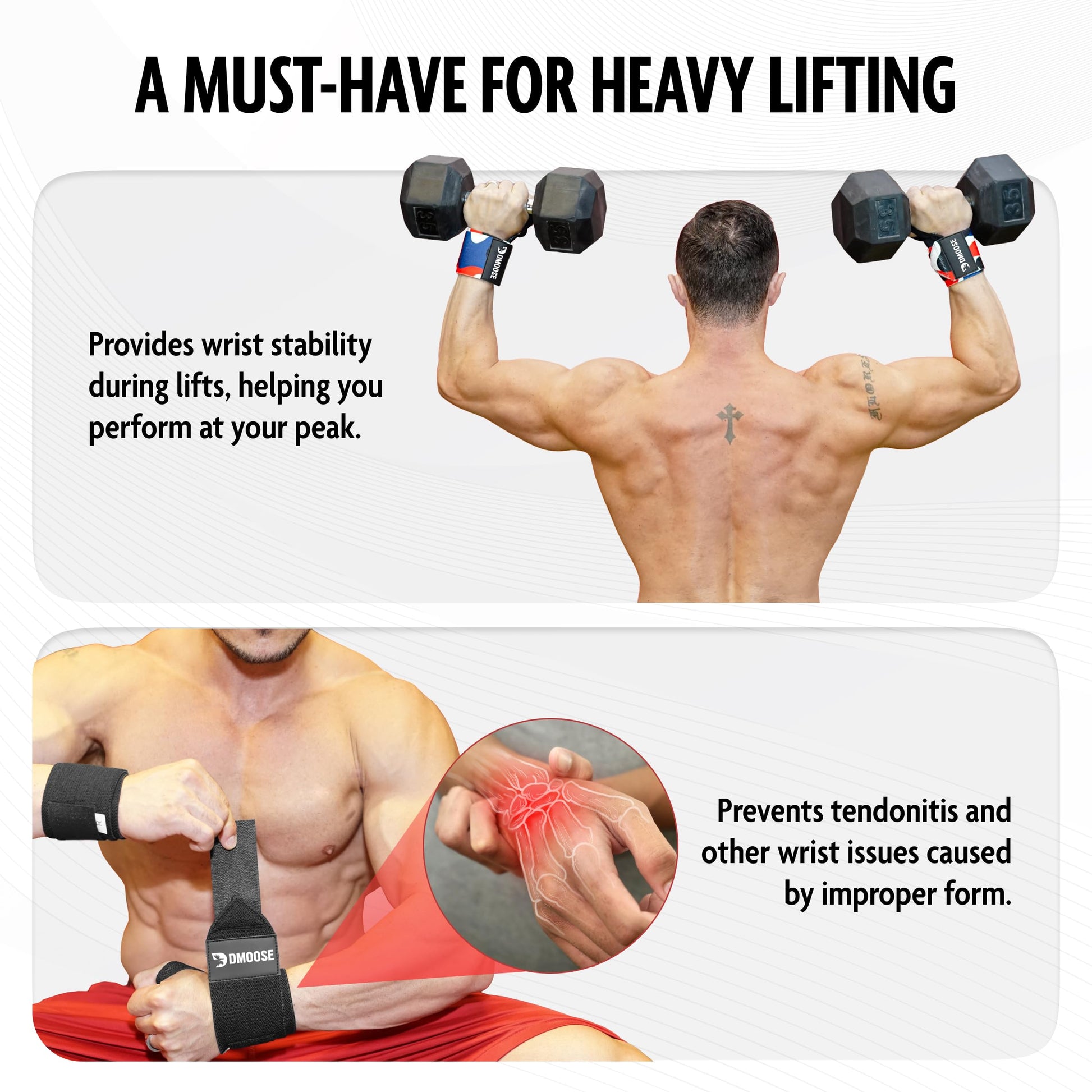 - šššššššš ššššš šššššššš ššš šššššš: Protect your wrists from common lifting injuries and strains with DMoose Gym Wraps. These Lifting Wraps are designed to prevent tendonitis and other wrist conditions by stabilizing your wrists and maintaining proper form during lifts. By reducing wrist stress, DMoose Workout Wrist Straps help you avoid painful injuries, allowing you to focus on progress and achieve your fitness goals safely and effectively.