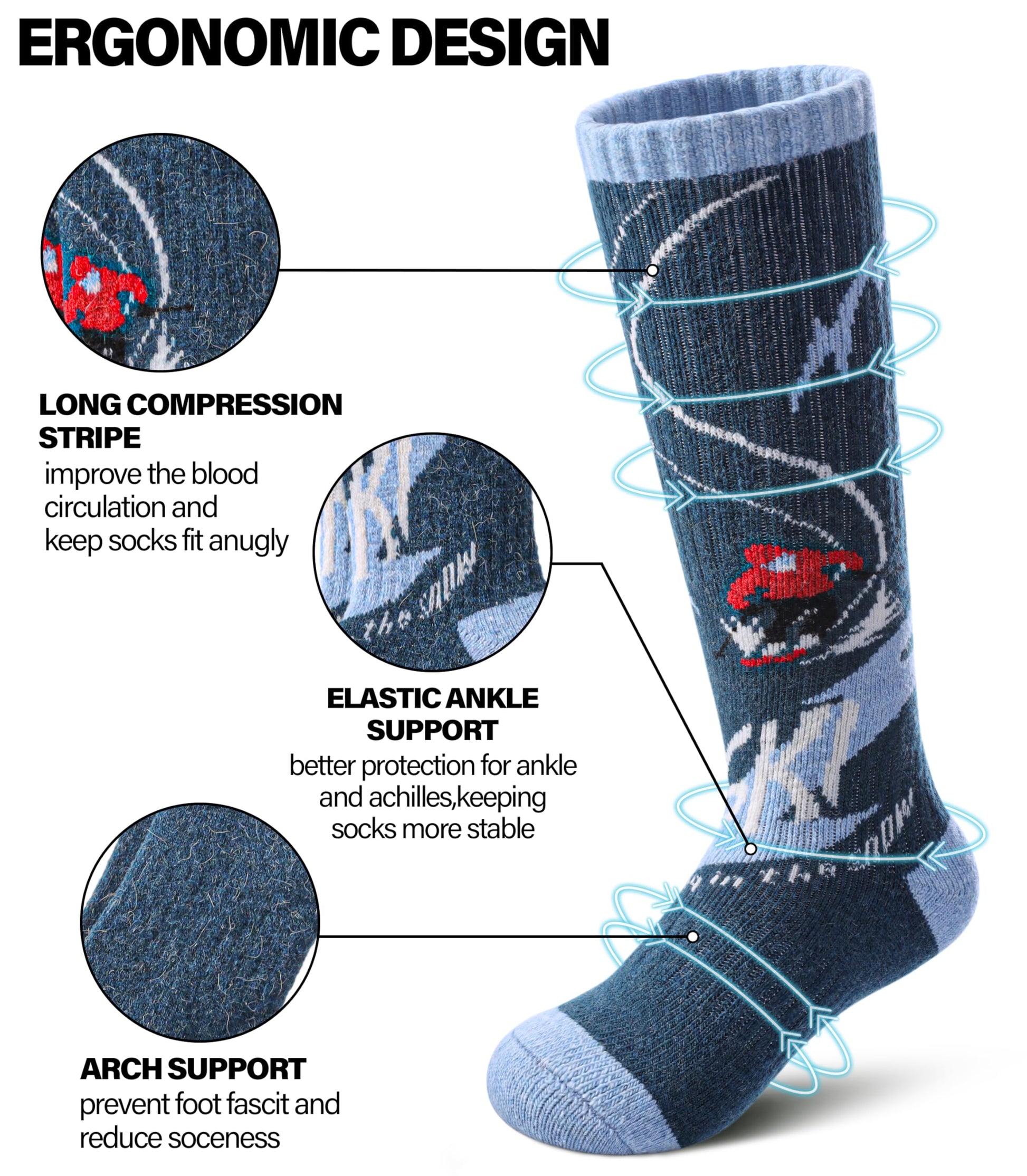 DOSKONI Kids Merino Wool Ski Socks Boys Girls Thermal Winter Warm Thick Cozy Socks for Skiing Snowboarding 3 Pairs Skate Green Blue Grey,8-12 Year Old