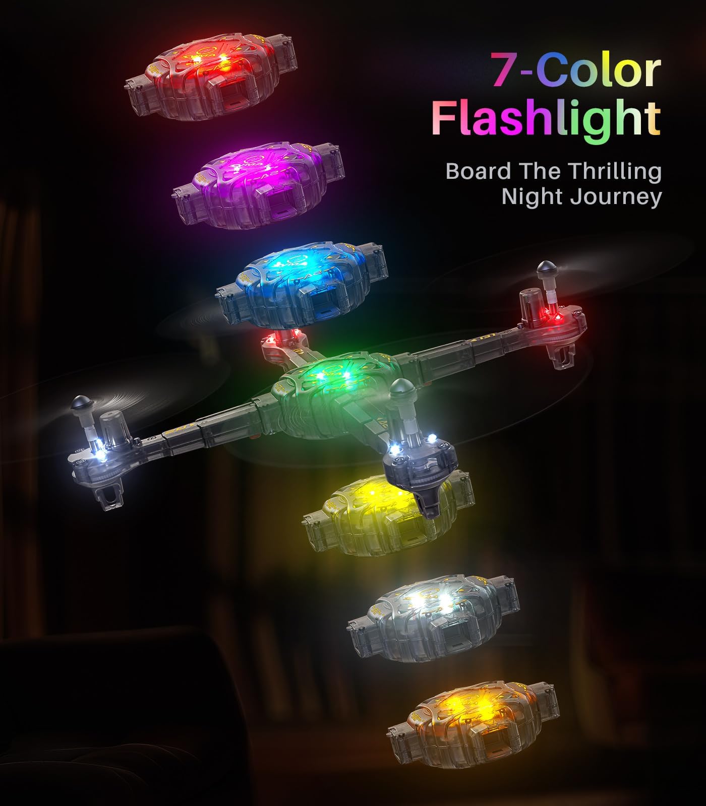 - 7-Color Light Show: Switch LED colors with the right joystick in standby mode or the left joystick during flight, cycling through seven vibrant options