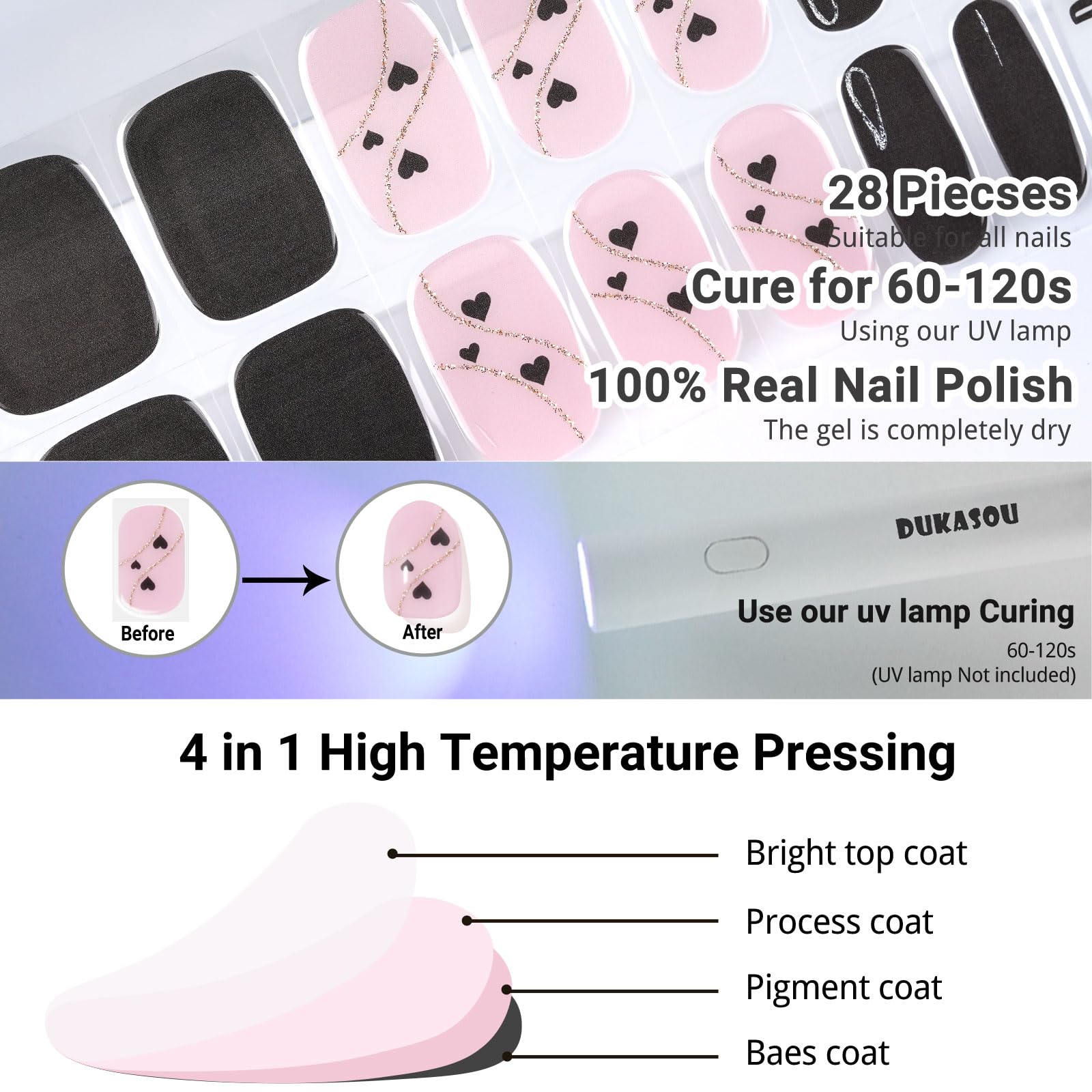 DUKASOU Semi Cured Gel Nail Strips, Black Heart | 28 pcs Gel Nail Strips Work with Any UV Lamp, Salon Quality Nail Stickers, Include Prep Pads, Nail File&Wood Stick