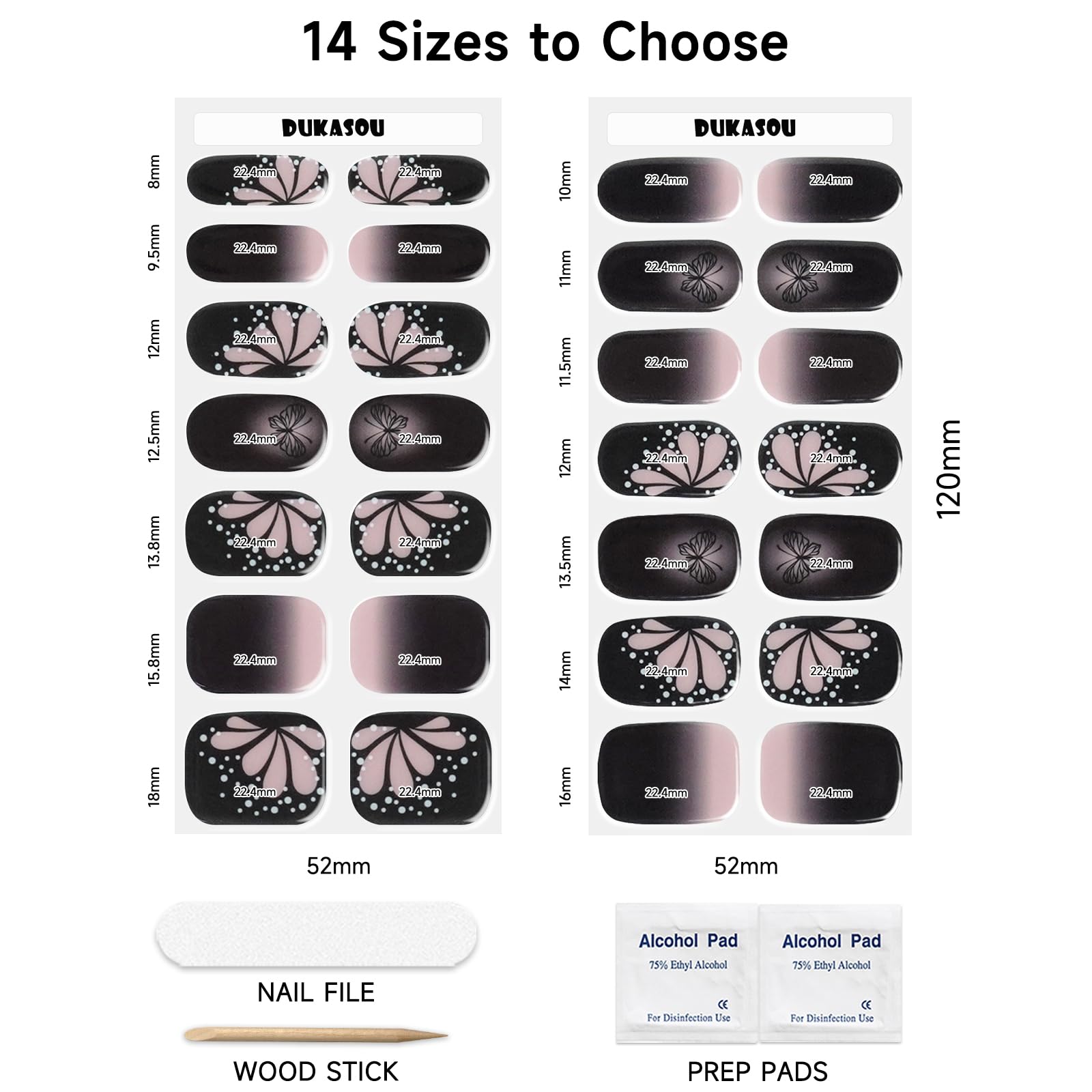 - Gel nail stickers set: DUKASOU semi cured gel nail strips package contains 28 stickers in 14 different sizes, it comes with 2 prep pads, 1 nail file, and 1 wooden stick (pressing the edge and removing), suitable for all nail sizes and shapes