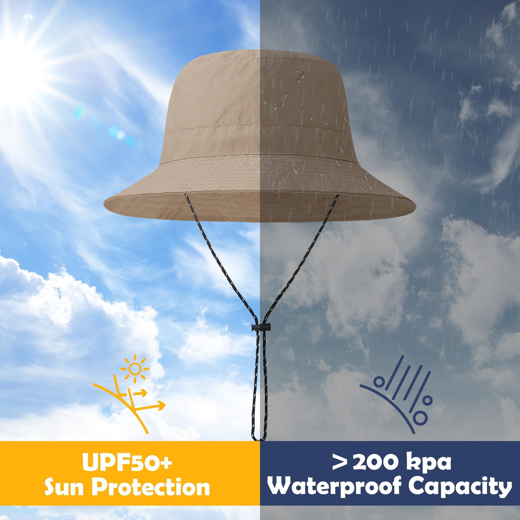 - WATERPROOF & SUNPROOF - Soft Top Waterproof Bucket Hat is made of high quality polyester material. It is lightweight and waterproof while providing UPF 50 + sun protection. Prevents sunlight from hitting the covered areas; the waterproof fabric prevents rainwater from seeping into the inside of the hat, so you can wear it normally when you encounter rainy or wet conditions outdoors