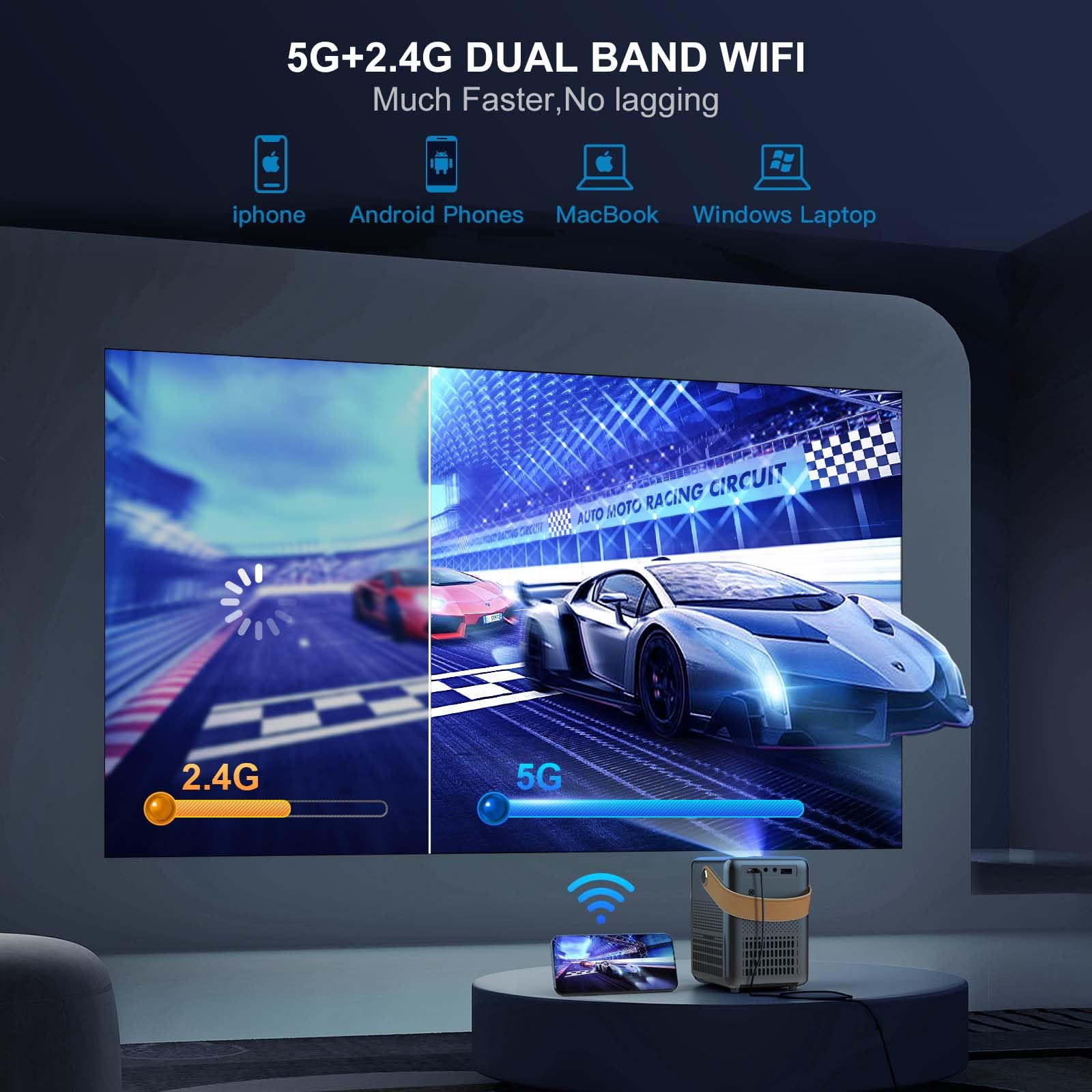 - 📶【Ultra-fast 5G WiFi & Bluetooth 5.2】P61 WiFi Bluetooth projector provides 5G/2.4G dual-band WiFi connections. which can effectively avoid signal interference, ensure a stable signal and fast transmission speed, offers much smoother and lag free online video streaming experience.While P61 Bluetooth projector adopts the latest Bluetooth 5.2 chip,which supports stable connection to various Bluetooth speakers/bluetooth earphones/airpots, bringing you more shocking and immersive sound.