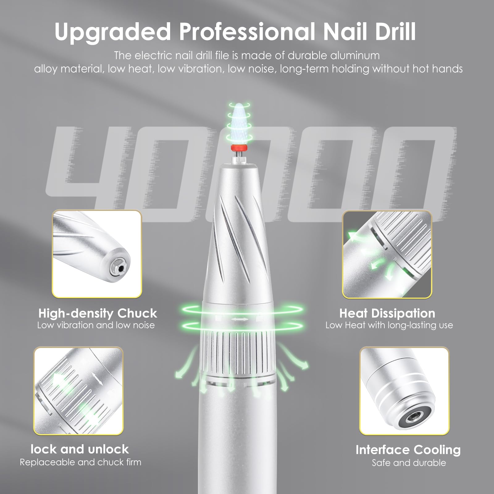 - Professional and High Speed- Nail e-file's handpiece is made of durable aluminum and equipped with high-quality bearings, which enables it to work smoothly at a high-speed adjustable speed of 0-4000RPM,low heat, low noise, super low vibration. Professional nail drills for acrylic nails can improve the efficiency of our nail art quickly and easily.