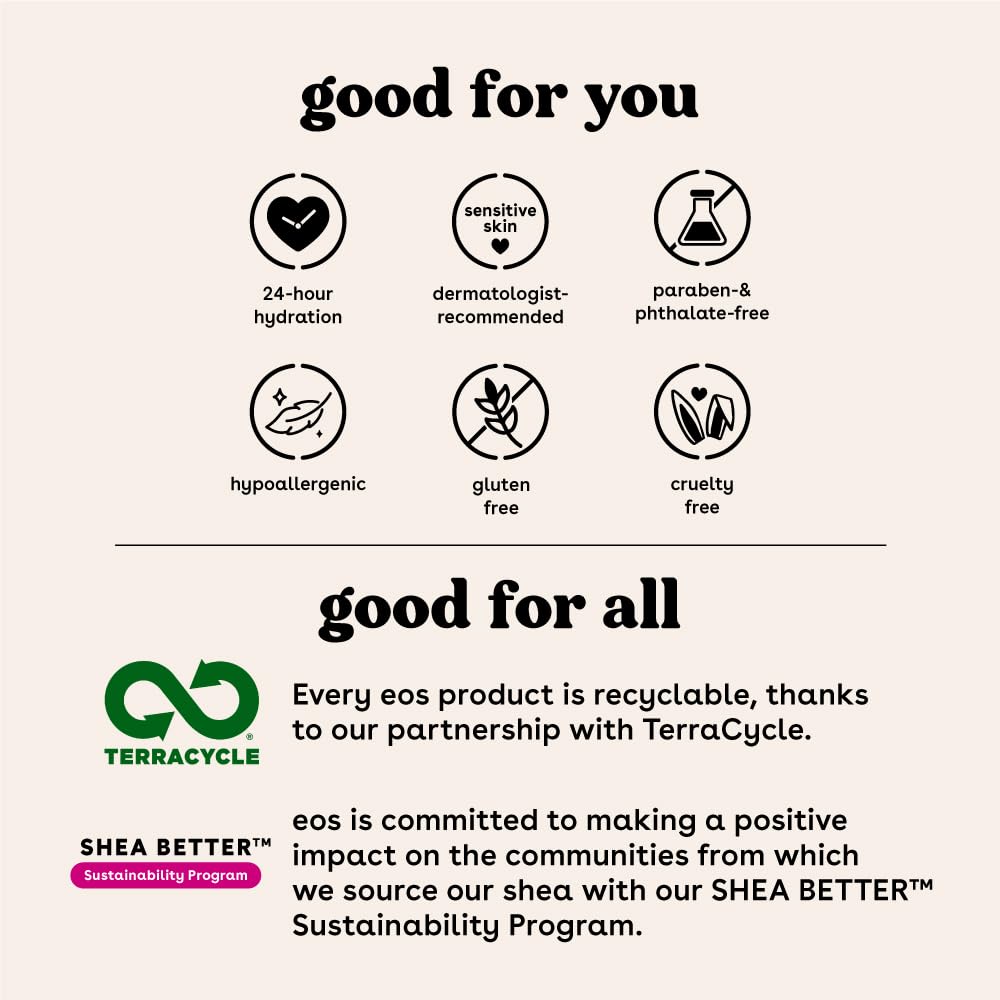 - SUSTAINABLY-SOURCED INGREDIENTS: eos lip balms have wild grown, sustainably sourced, natural shea butter and oil to leave your lips smooth and nourished