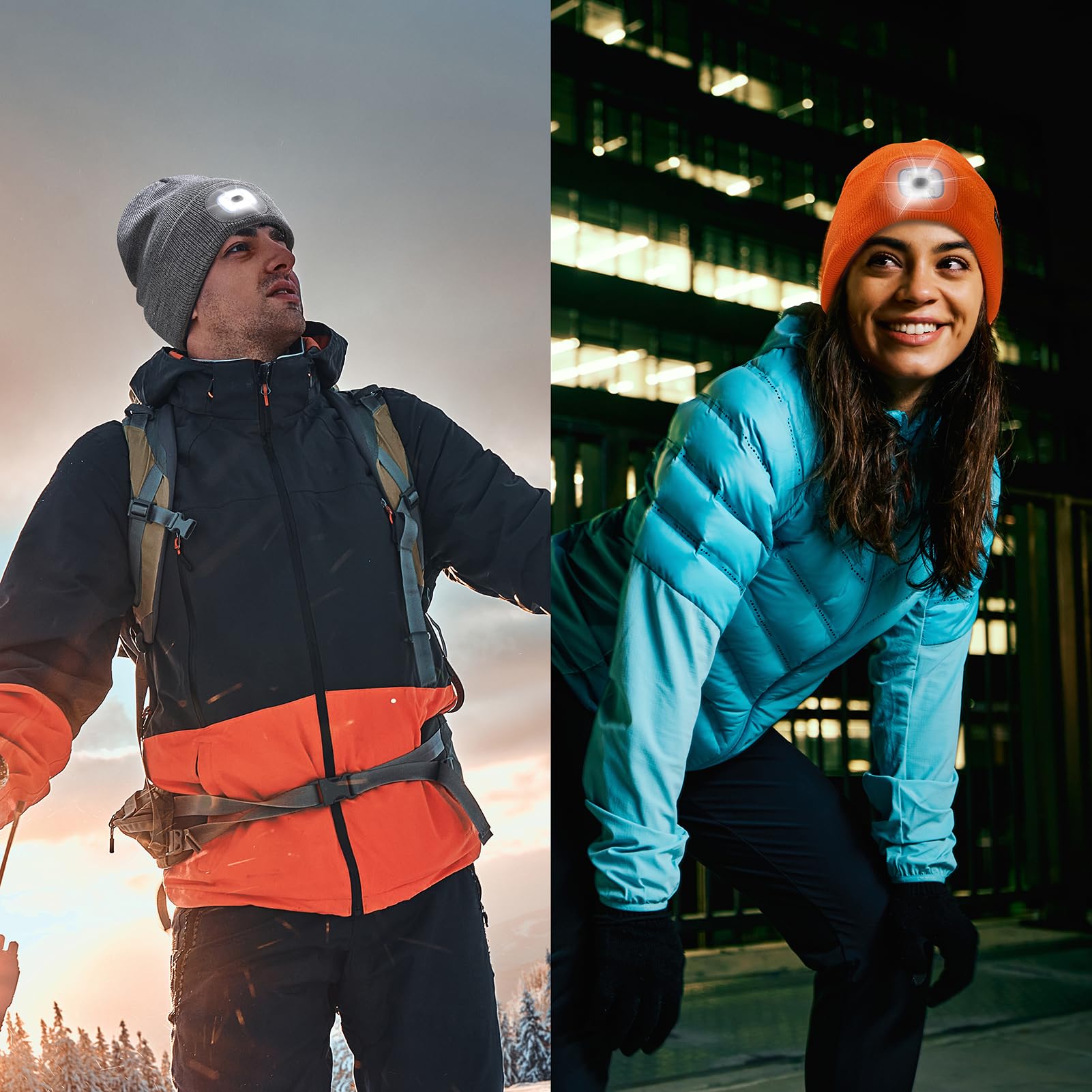 - Three Brightness Settings--Our beanie LED cap has 3 brightness levels,you can adjust the brightness by pressing the button. Lighted the Beanie Cap Provides incredible hands-free lighting for finding your way in the dark or completing tasks in poorly lit environments.