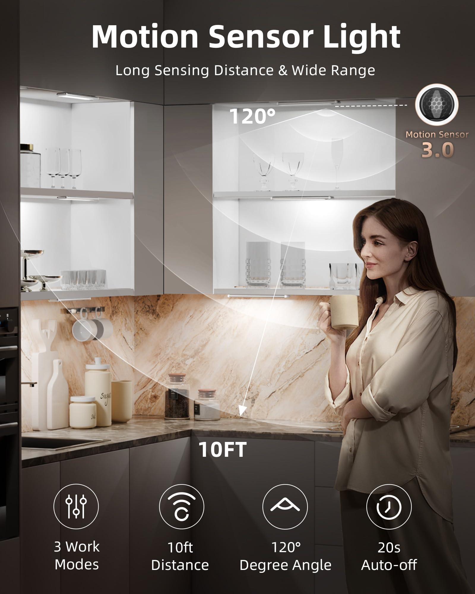 - 【Motion & Daylight Sensor】—In [Day Mode], the motion sensor lights turn on with motion day or night, but [Night Mode] is activated only in dark environments when movement is detected within a 10ft / 120° range and shuts off automatically after 20 seconds of no movement. To conserve energy, it won't turn on in sufficient daylight.The lights are ideal as closet lights, under cabinet lights wireless, wine cabinets lights, and display lighting, rechargeable under cabinet lighting.