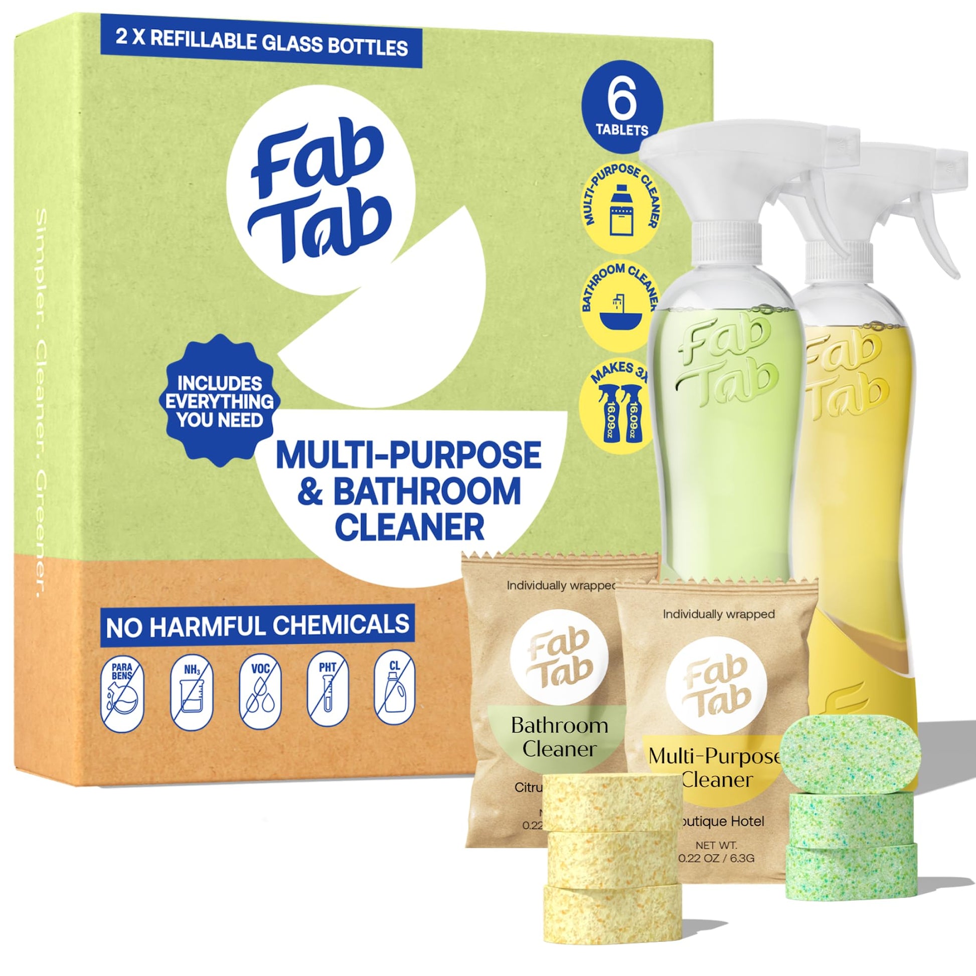 Fab Tab Tablet Cleaner, Multi-Purpose & Bathrom Cleaner for Eco-Concious Cleaning, Non Harmful & Chemical-Free Formula, Convenient Refills with 2 Glass Bottles, Luxury Hotel Scent (6 Refill Tablets)