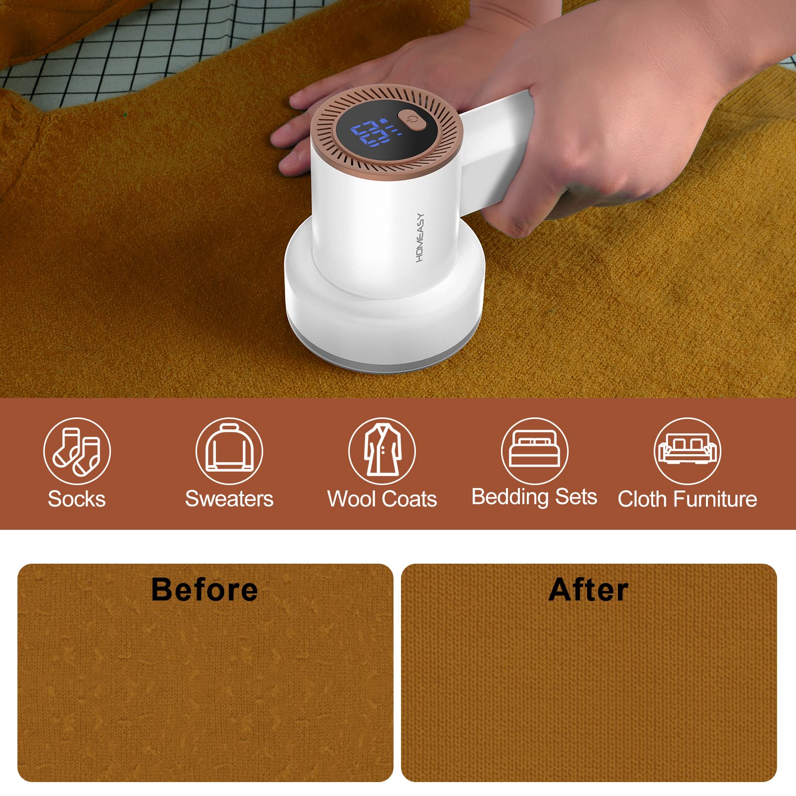 Fabric Shaver Fuzz Remover Rechargeable, HOMEASY Electric Lint Remover Shaver with 3 Blades & LED Digital Display, Sweater Couch Fabric Pill Shaver for Sweater, Couch, Furniture (White)