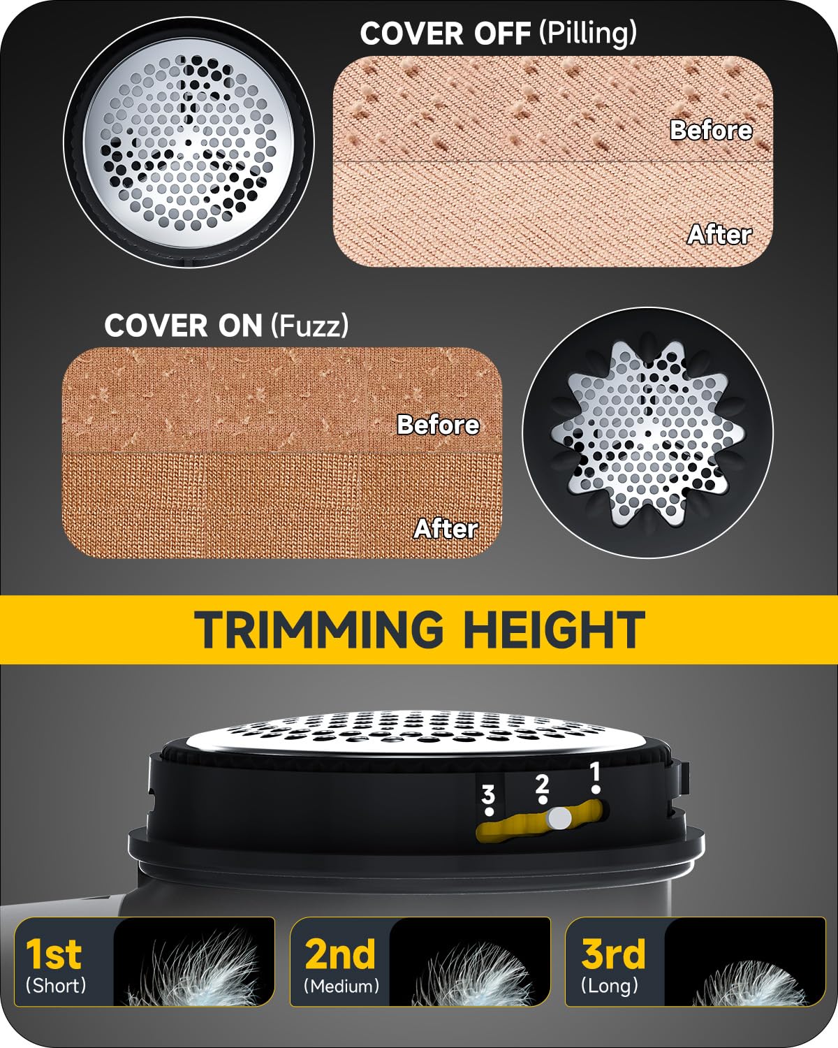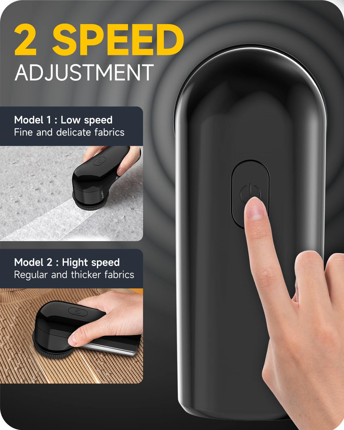 - Efficient Fabric Shaver - With 2-speed power adjustment and 3 shave heights, this fabric shaver can help to easily and quickly remove all kinds of pills, fuzz, fluff on your sweaters, jerseys, blankets, bed sheets, couch and more. Keep your clothes breath fresh air.