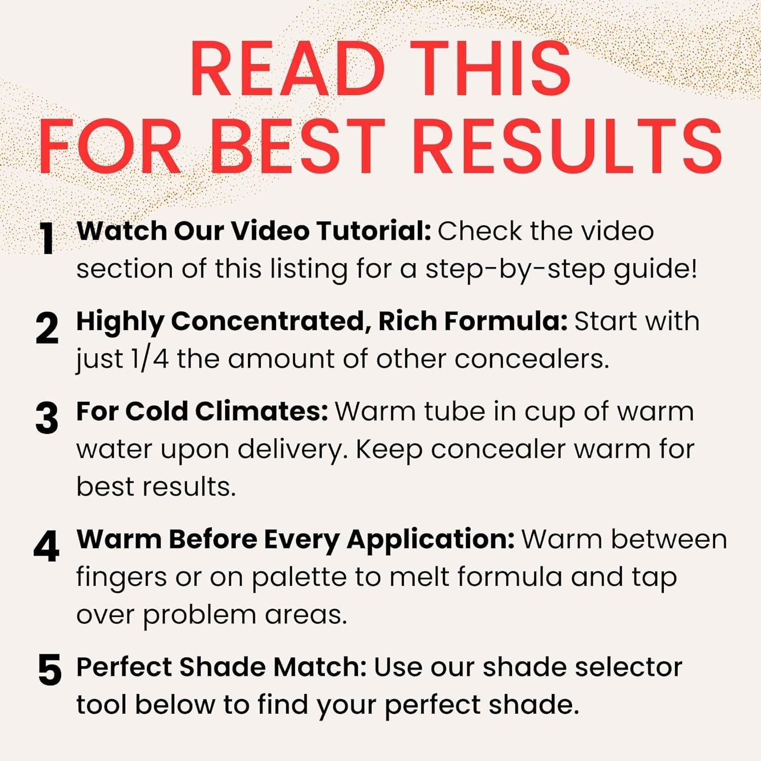 - Read This For Best Results - Use only 1/4 the amount of typical concealers; warm on fingers or a palette until it melts for flawless application. Use our shade selector tool to find your perfect match. For cold climates, keep the product warm before use, and visit our video section for a step-by-step tutorial.