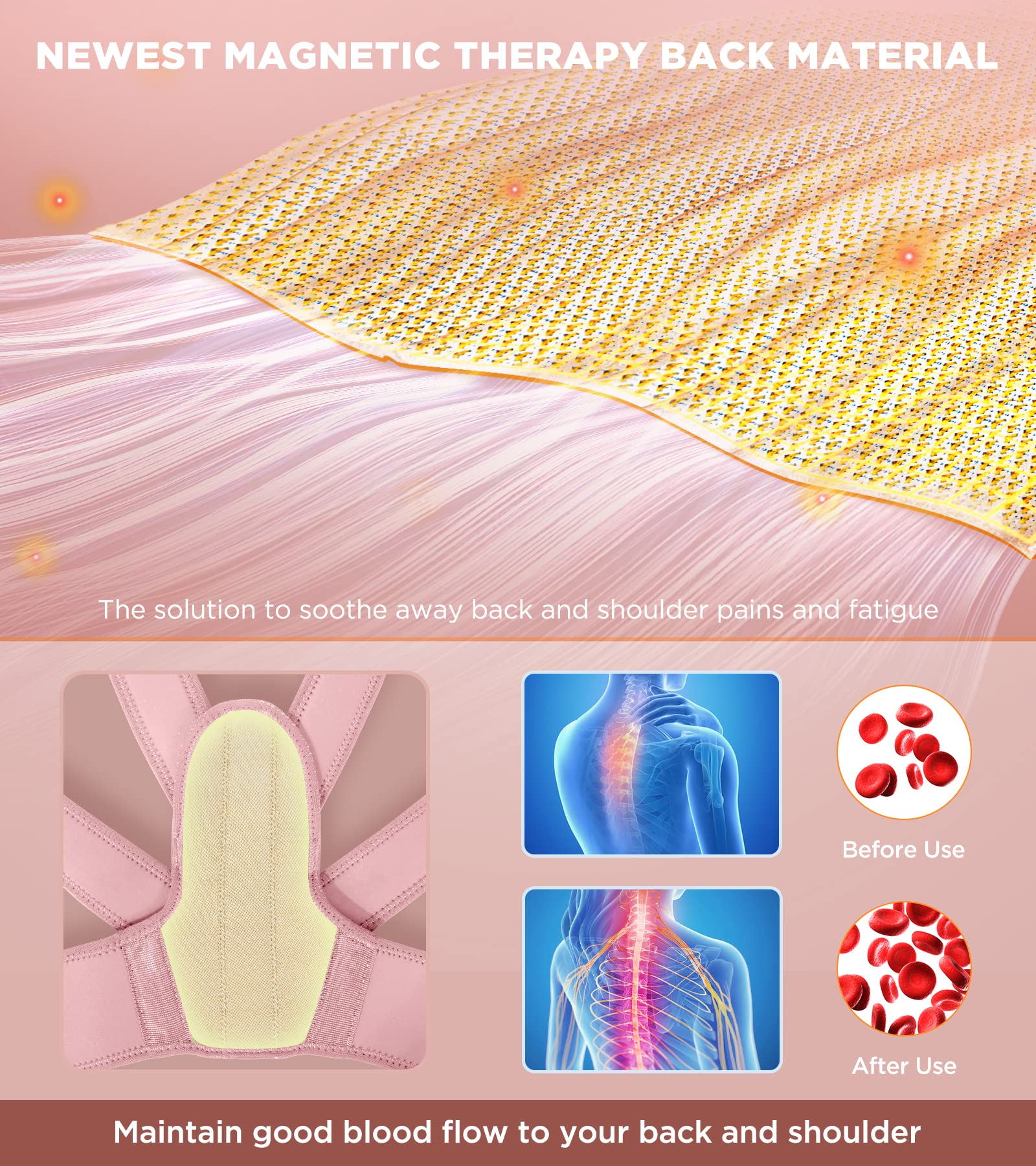 - 【SIMPLY ENJOY MAGNETIC THERAPY BACK SUPPORT - SAY NO TO FATIGUE】The back lining of the back brace posture corrector is covered with breathable and soft magnetic therapy cloth that implants millions of permanent magnetic particles. It is sweat-resistant, promotes blood circulation to alleviate fatigue, and eliminates back and shoulder pain and muscle stress. This back brace for posture is a great entry point into a good, healthy posture for those looking to try a new back support device.