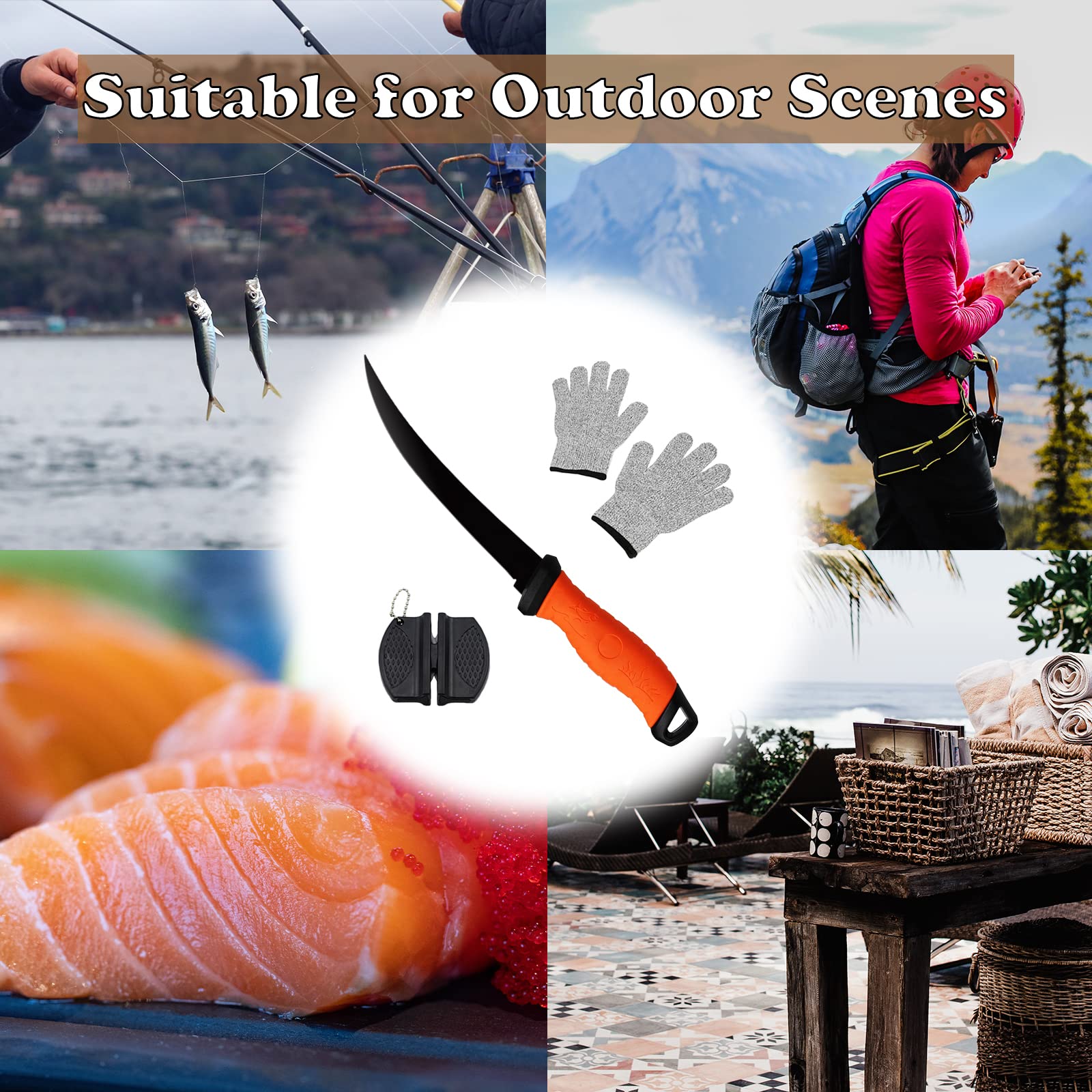 Fish Fillet Knife, 7 Inches Professional Fishing Fillet Knife Set Stainless Steel Blade in Corrosion Resistant Coating, with Sharpener and Cutting Resistant Gloves, for Fishing and Outdoor, Orange