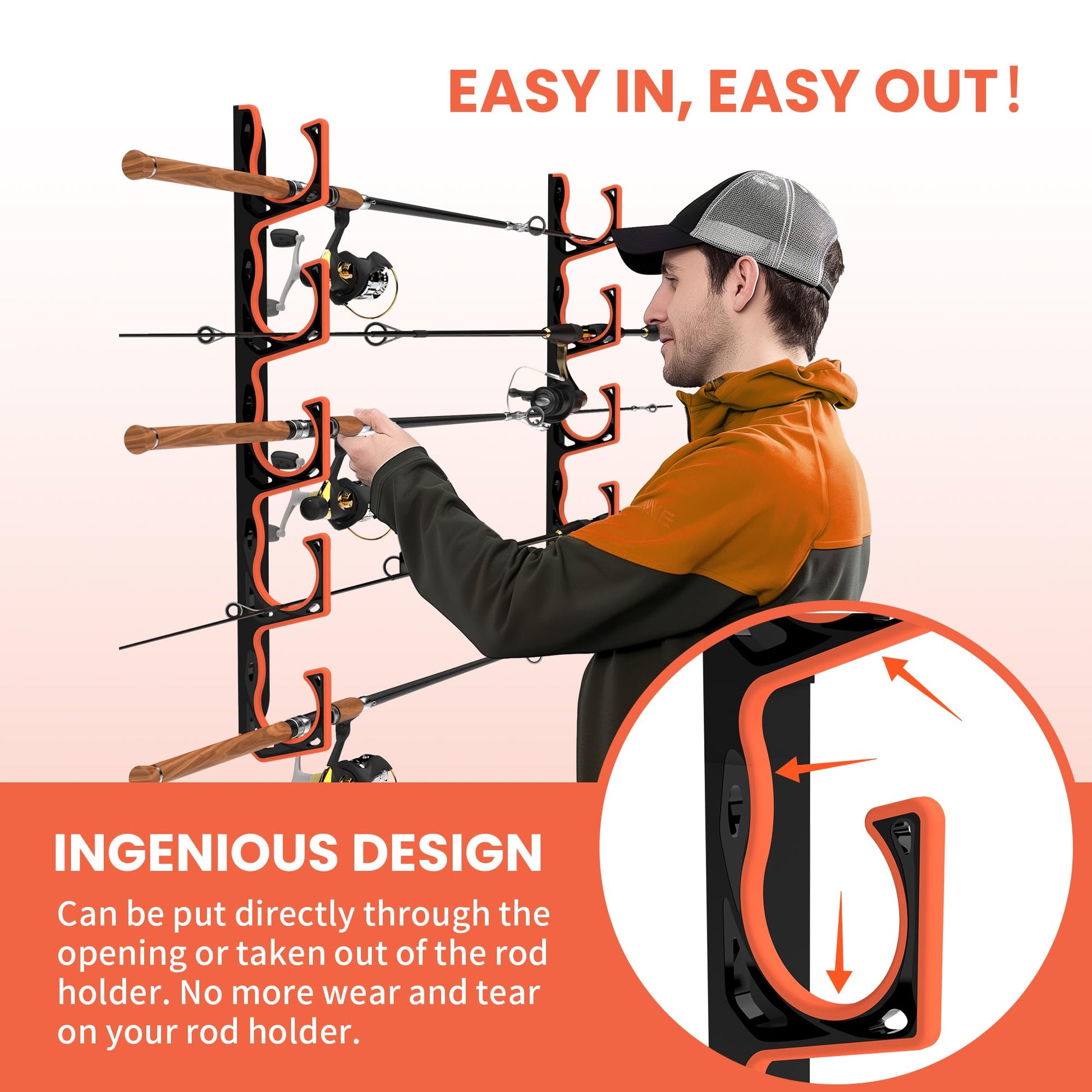 - EASY IN & EASY OUT - Innovative Opening Design. Unlike other fishing rod rack, our design allows for effortless rod placement and removal from above, making it convenient to store and retrieve your fishing gears.