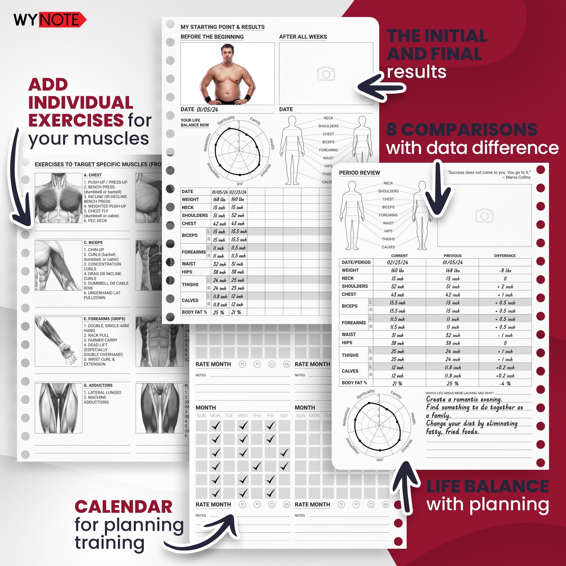 - šššØš«š¤šØš®š ššØš for women and men contains 14 pages of notes, there are additional notes in the calendar, cardio, on the workout page, under exercises and in comparison periods.