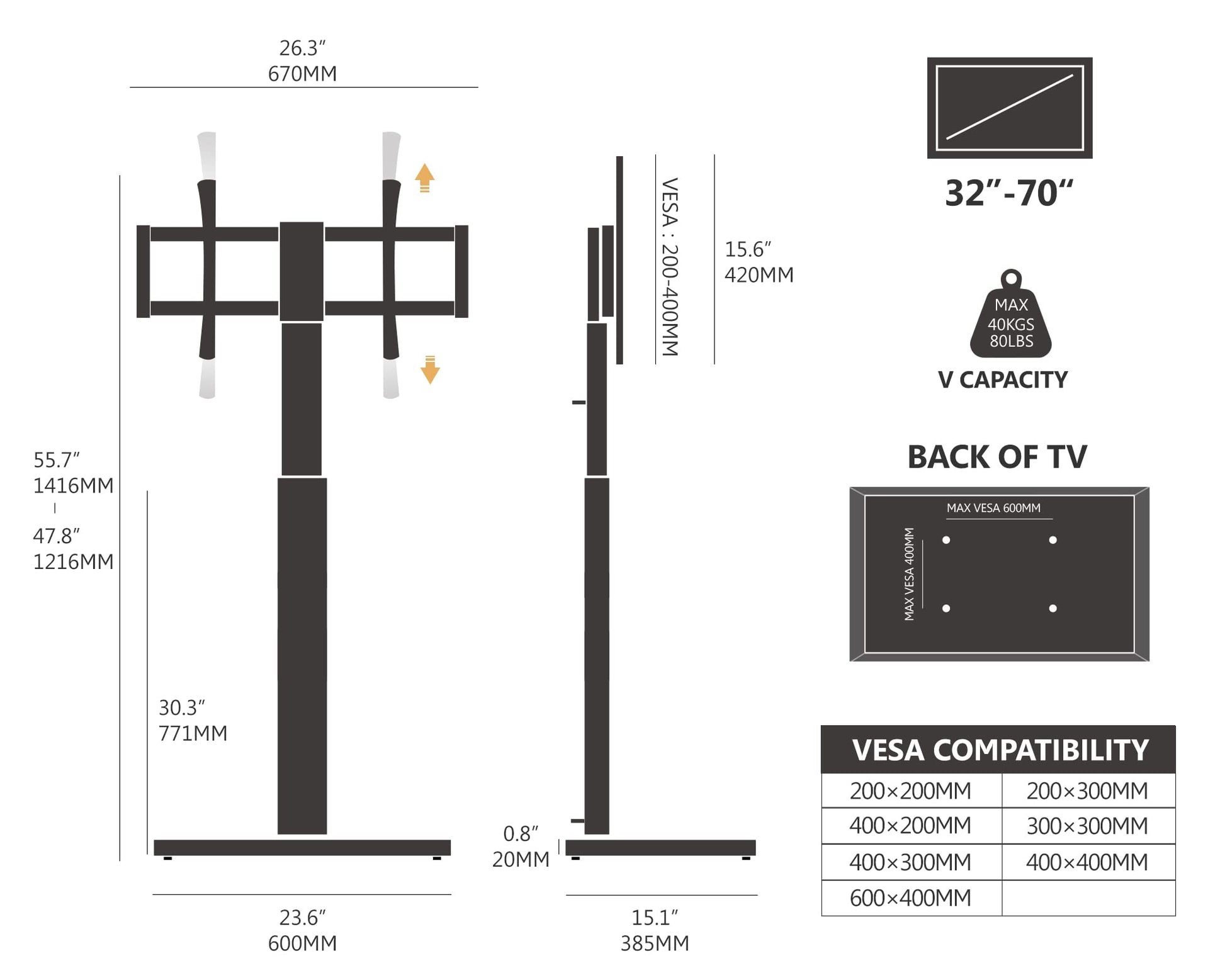 - Notice before buying - Will it fit LG TV? Sony? Vizio? Samsung? Not a problem. Make sure your TV meet the following conditions: TV Compatibility: Fits most 32 to 70 inch flat-panel LCD/LED/Plasma TVs up to 88lbs. VESA(mounting hole pattern): 200(w)x200(h)-600(w)x400(h)mm. Height Adjustable:2 types of height adjustment, height range: 47.8- 55.7 inches.