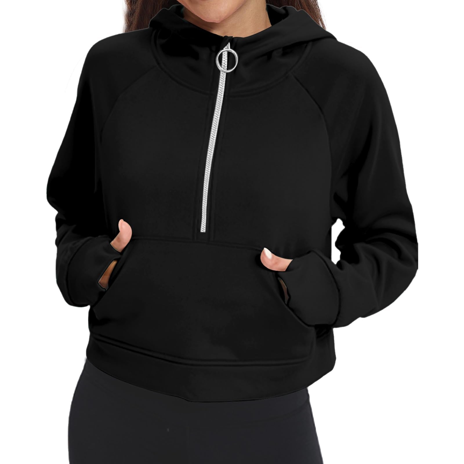FKEEP Womens Half Zip Hoodies Quarter Zipper Up Cropped Sweatshirt Long Sleeve Athletic Pullover Tops with Thumb Hole(Black,Large)