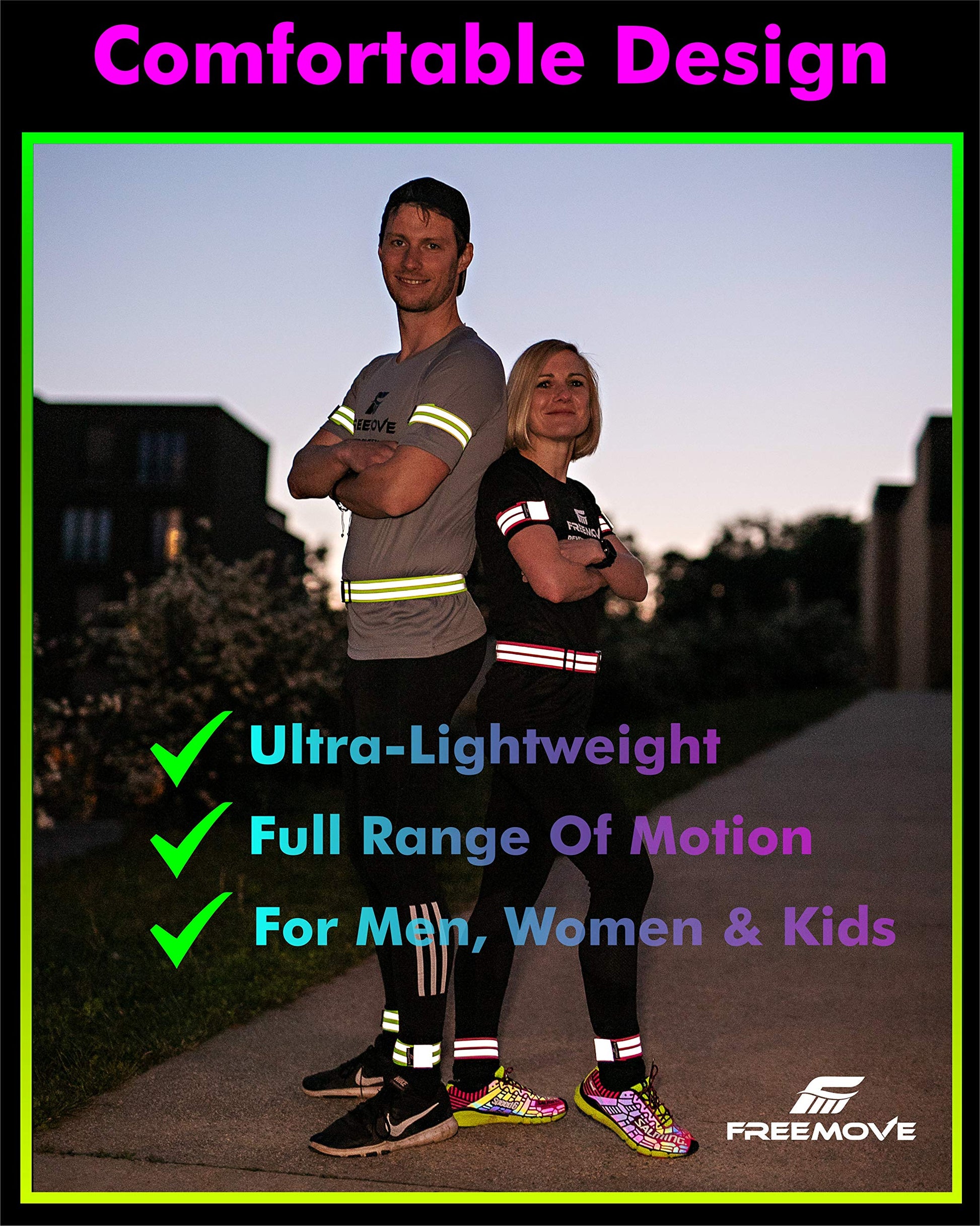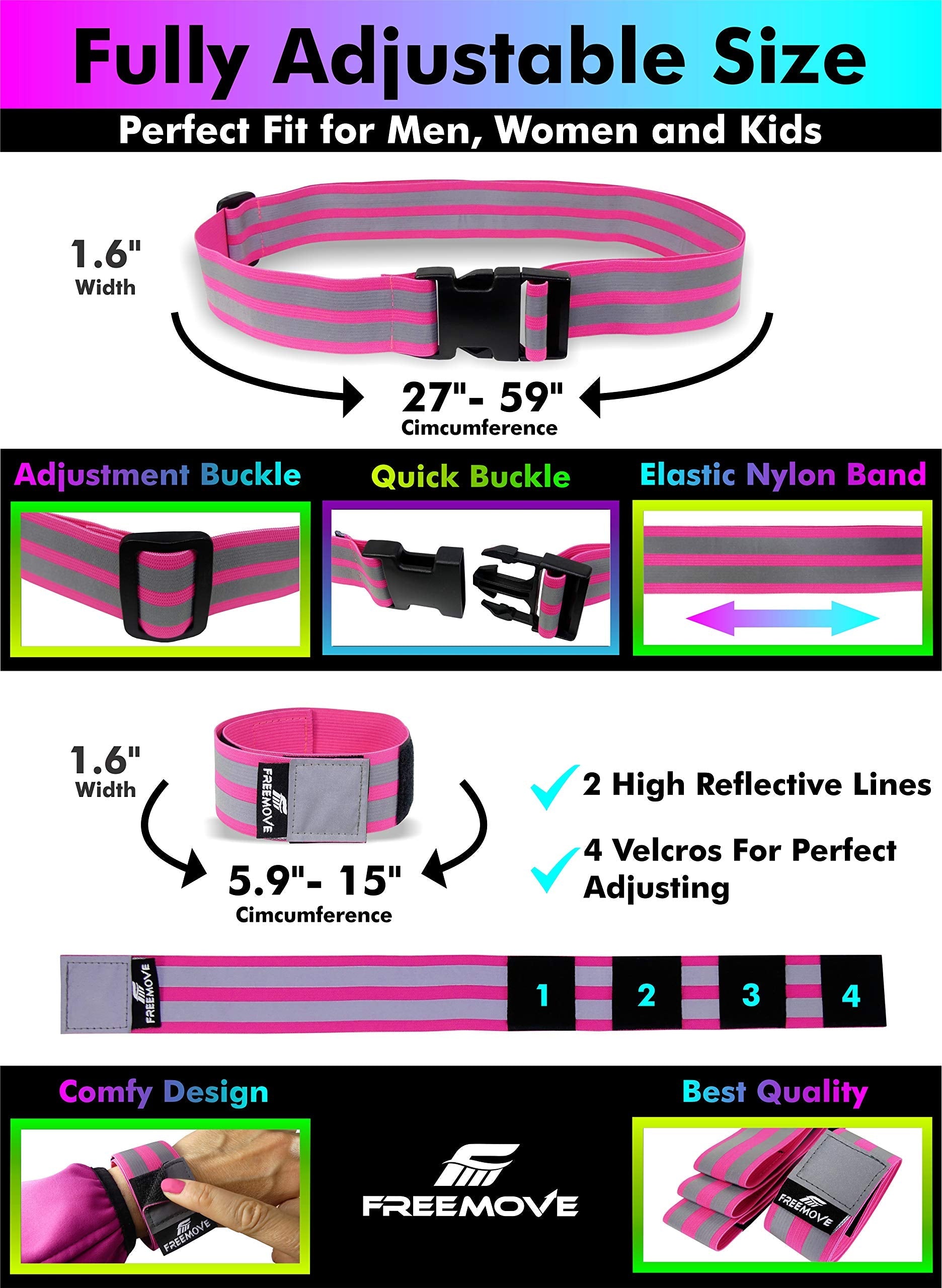 FREEMOVE Reflective Running Gear - a Pack with Adjustable Runners Waist Belt + 4 Arm/Wrist Bands for Men and Women - Stay Safe Day or Night When Dog Walking, Running, Cycling, Jogging, Biking, MTB