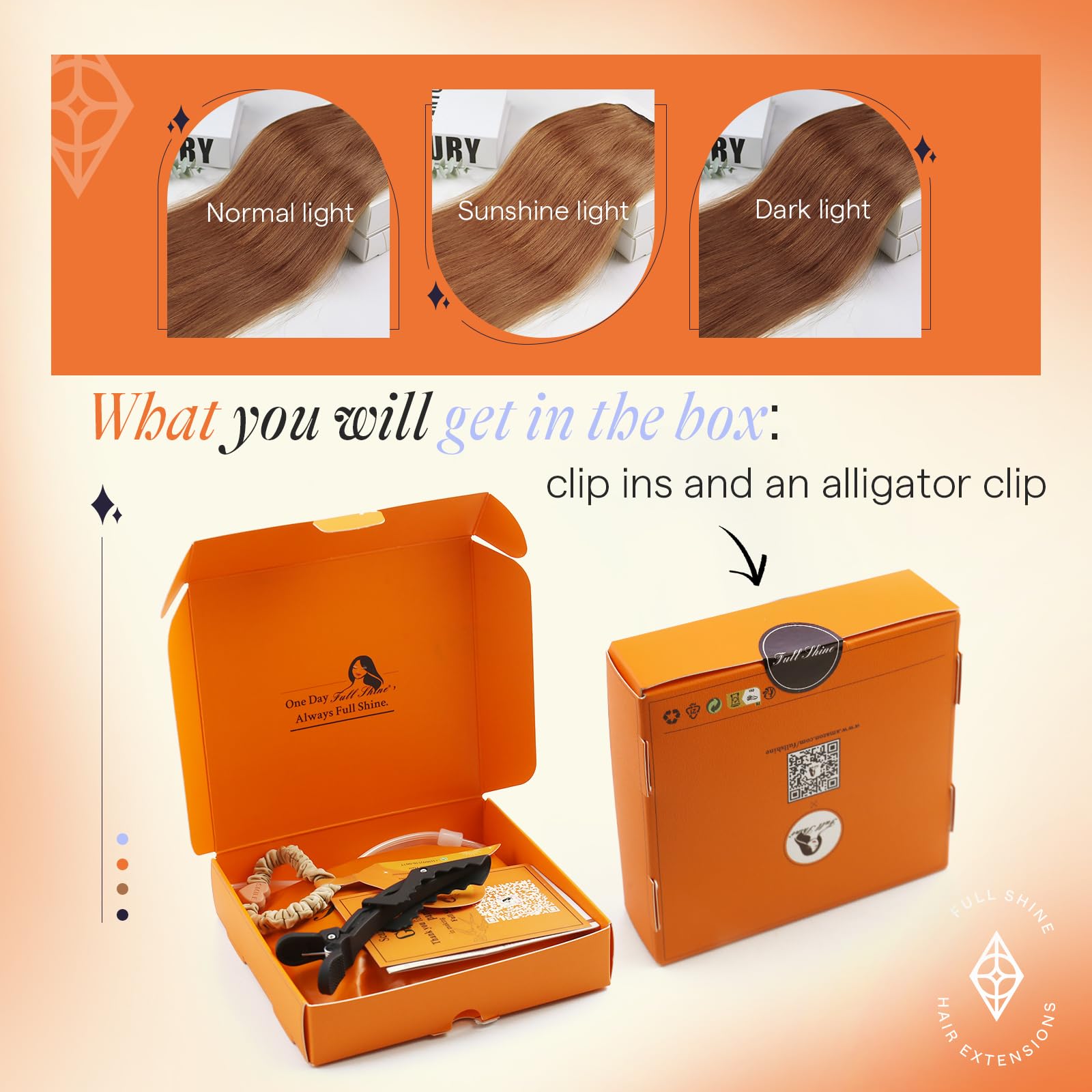 Full Shine Copper Brown Clip in Hair Extensions Real Human Hair Thick Hair Extensions Clip ins Copper Brown Human Hair Clip in Extensions Triple Weft Extensions Extra Volume 16 Inch 7 Pcs 135 G