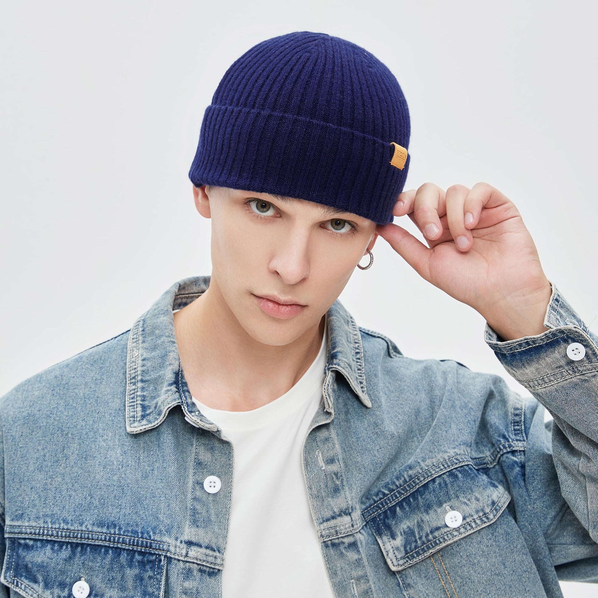 FUQILA 100% Merino Wool Fisherman Beanie Hat, Unisex Warm Winter Hats, Soft Breathable & Cozy Stretchy Knitted Short Cuffed Cap (Dark Blue)