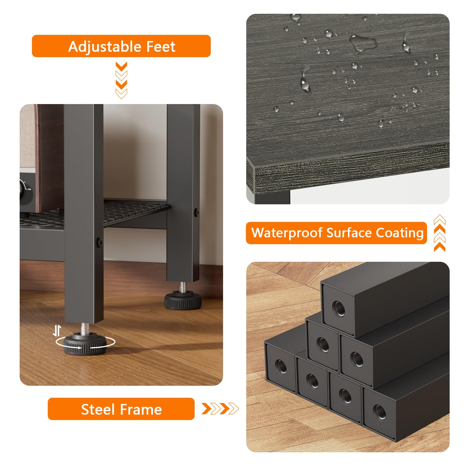 - Sturdy TV Table: The combination of exquisite particle board and metal frame provides stable support for the tv entertainment center. Adjustable feet to keep level and avoid scratching the floor. The mesh shelves can support up to 25 lbs, the wooden top can support up to 45 lbs.