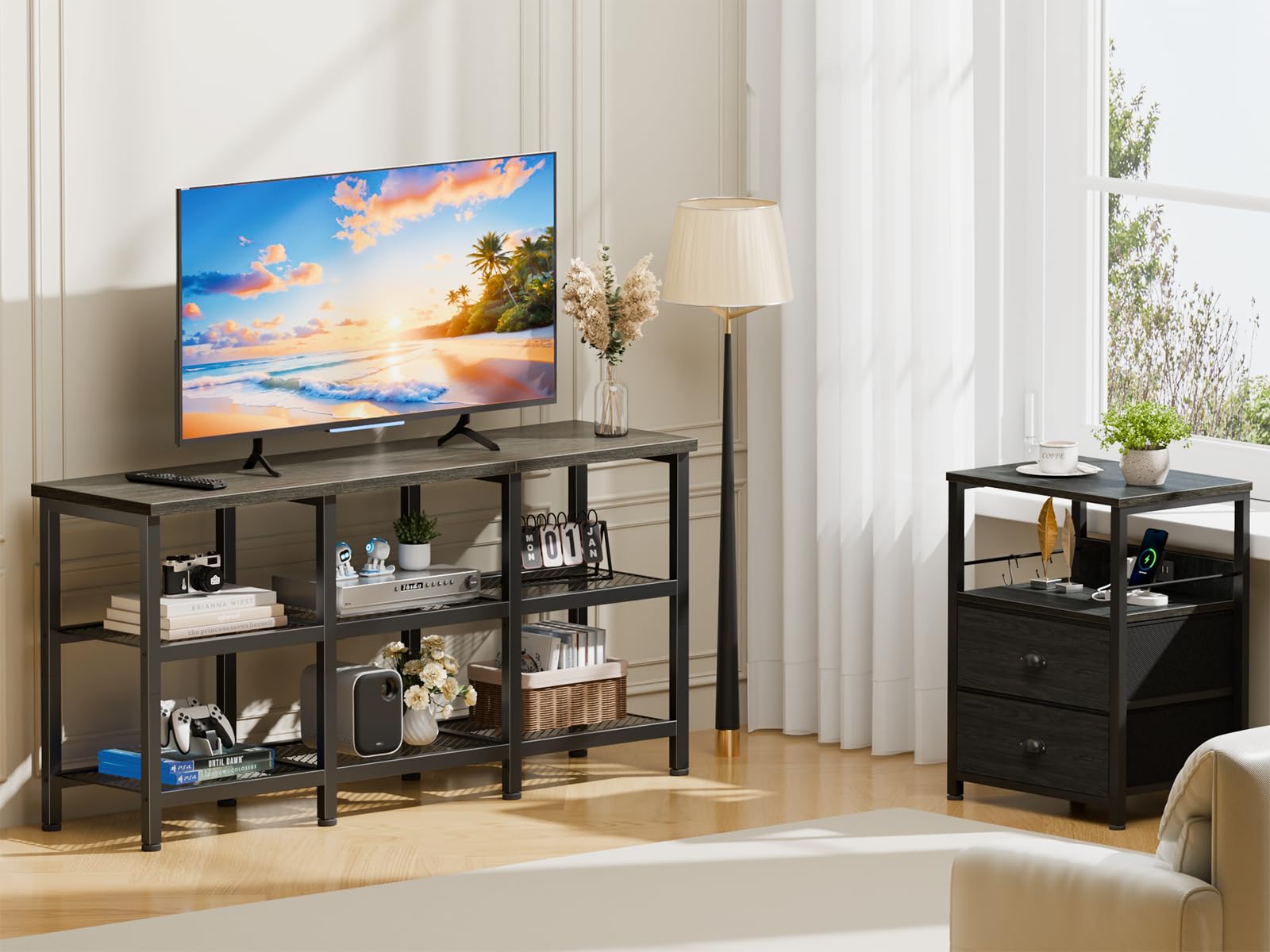 - TV Stand with Metal Shelves: The open shelves and metal mesh design allows for better ventilation, we don't need to worry about equipment overheating in confined spaces, and provides easy cable access. In addition, the open space design will make it easier to store items.