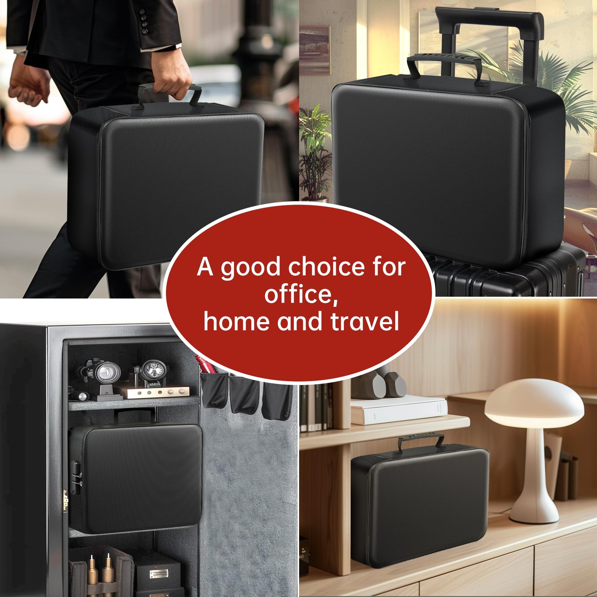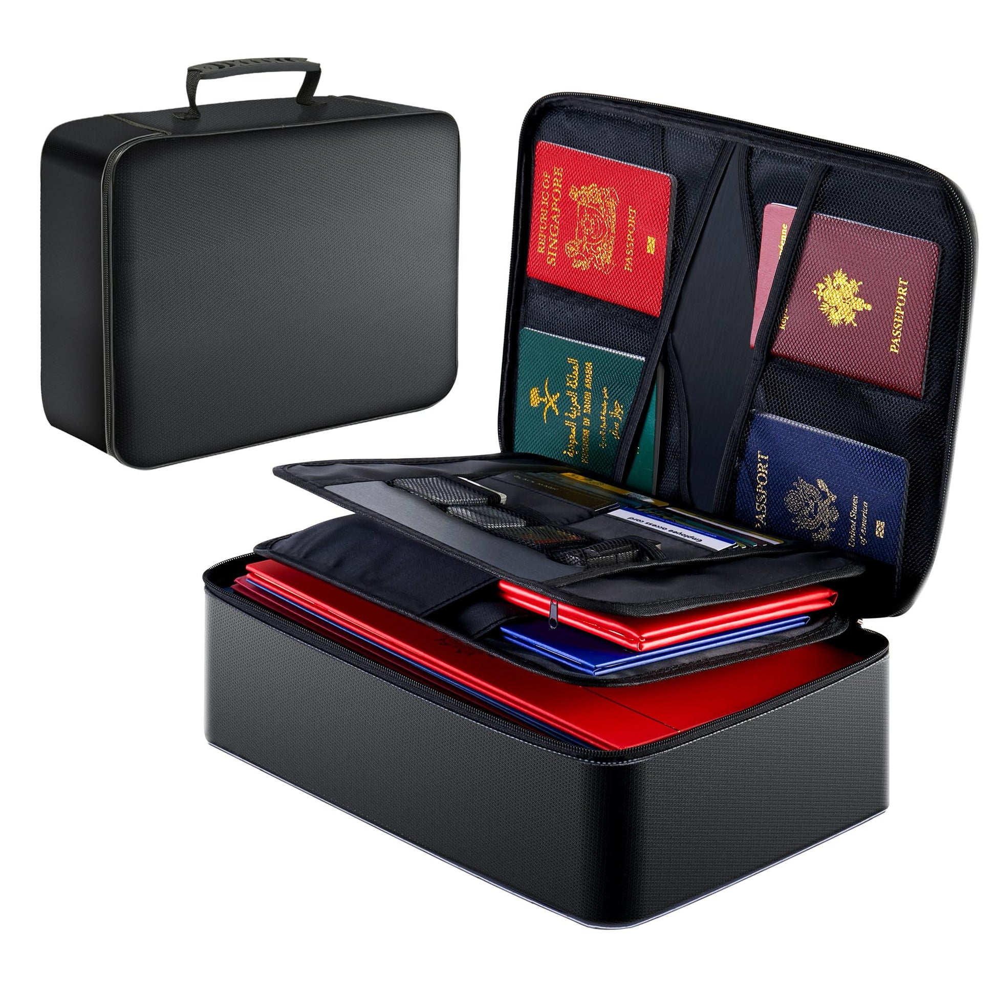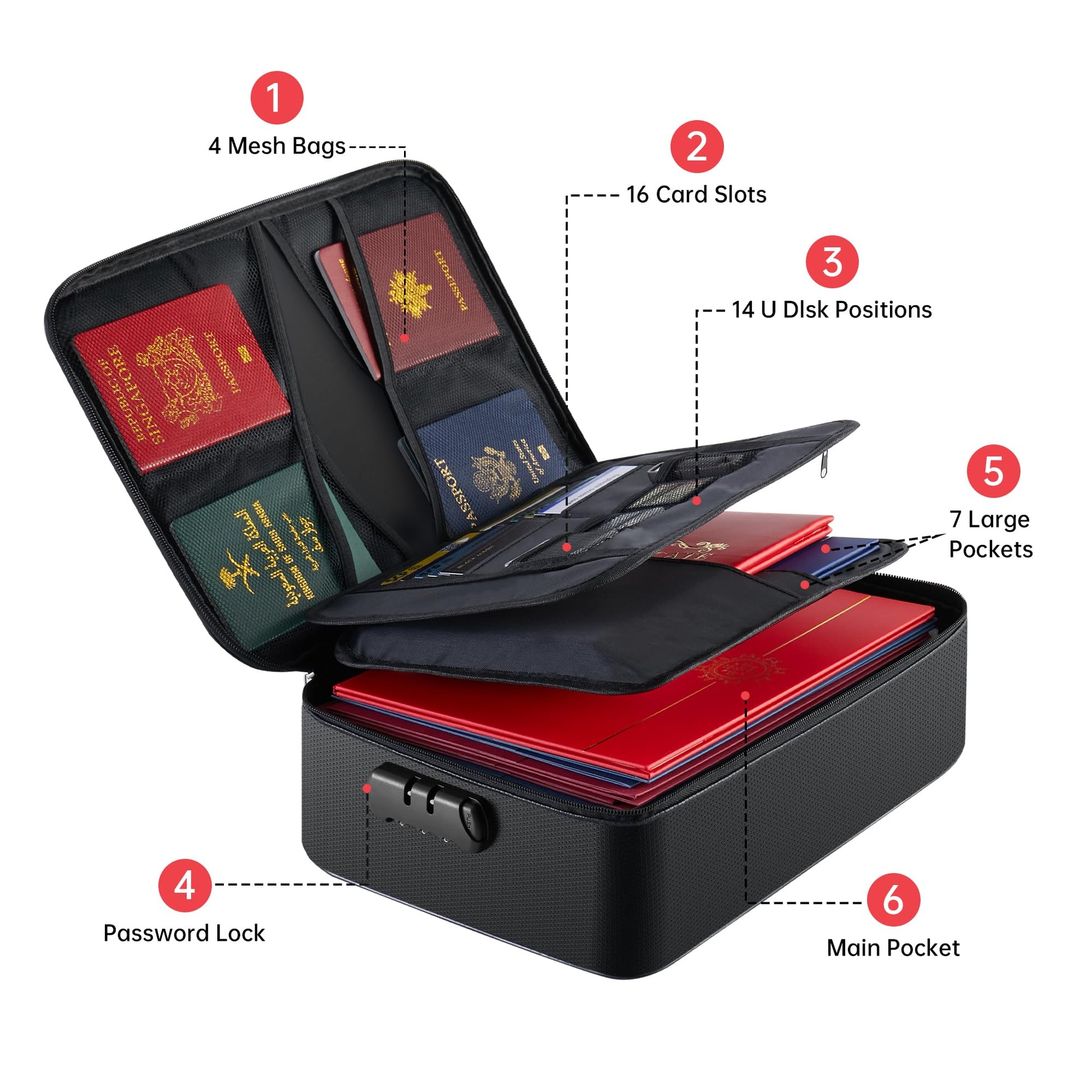 - 【Soft Box】 Large-capacity(14.2'x10.6'x4.2'),Compared with other bags,our fireproof file organizer adopts a multi-layer design that can meet all your storage needs. These include 8 passport mesh bags,16 card slots, 4 U Disk pockets, 7 folder layers and one main pocket with a large space. It can store your important documents,files,money,passport,U Disk,cards,laptop,certificates in a safe and orderly way.Great way to organize your files easy for you to find whatever files you looking for quickly.