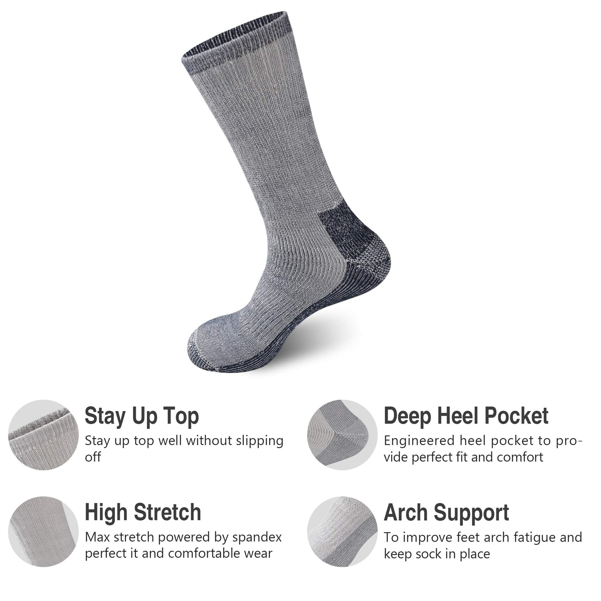 Merino Wool is a natural moisture management fiber that wicks moisture and Super soft to provides natural comfort for all seasons.Each pair is cushioned throughout and reinforced from heel to toe for maximum comfort and durability. These wool cushion crew socks designed for extreme weather conditions, great cold weather gear for outdoor activities and sports like skiing. Terry-loop cushioning throughout the entire foot, making the socks suitable for hiking, ountaineering, outdoor camping, cycling and longtime outdoor work.