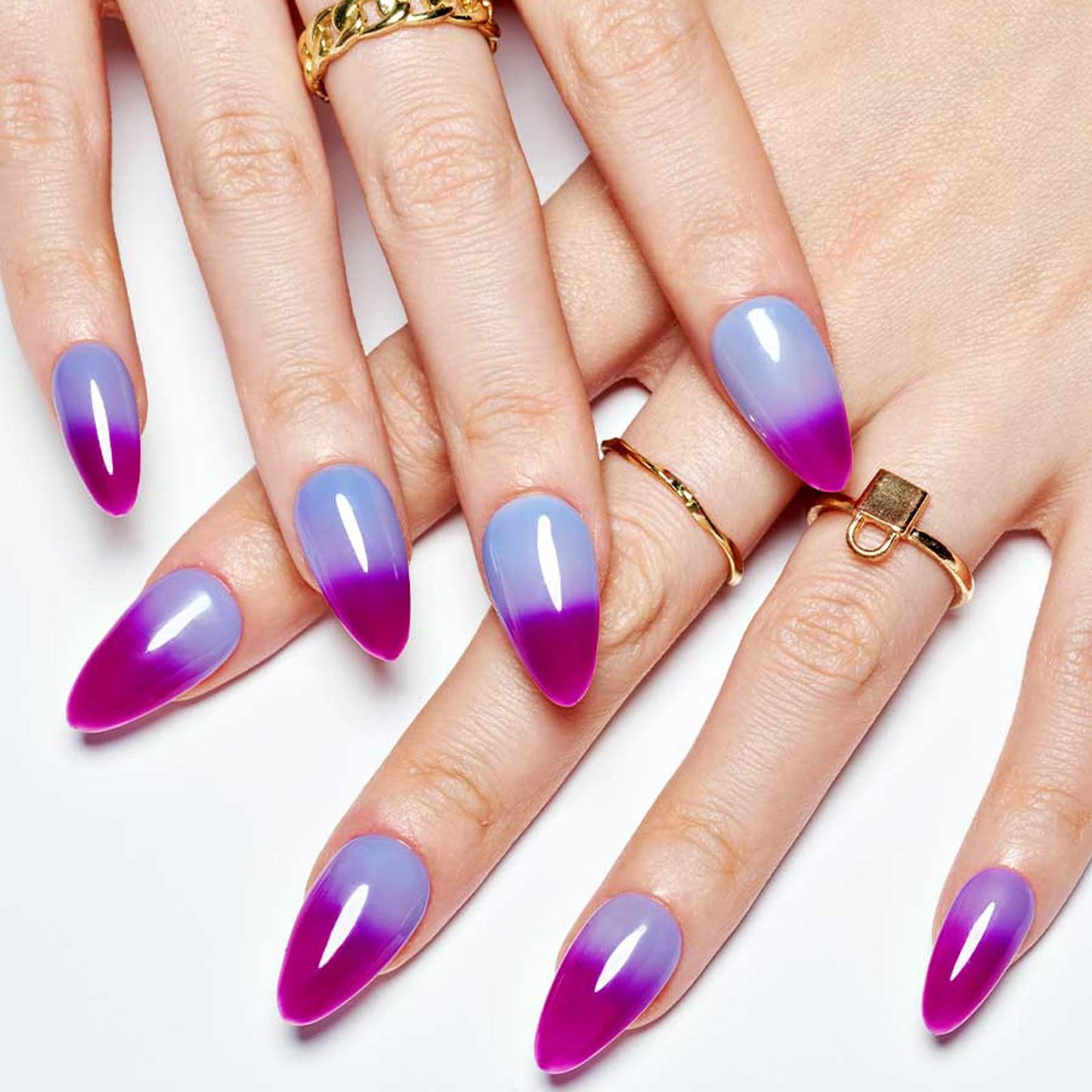 GLAMERMAID Press on Nails Medium Almond, Handmade Purple Blue Temperature Change Gel Glue on Nail, 24Pcs Glossy Short Stiletto Reusable UV Finish Fake Nails Acrylic False Nails Manicure Kits for Women