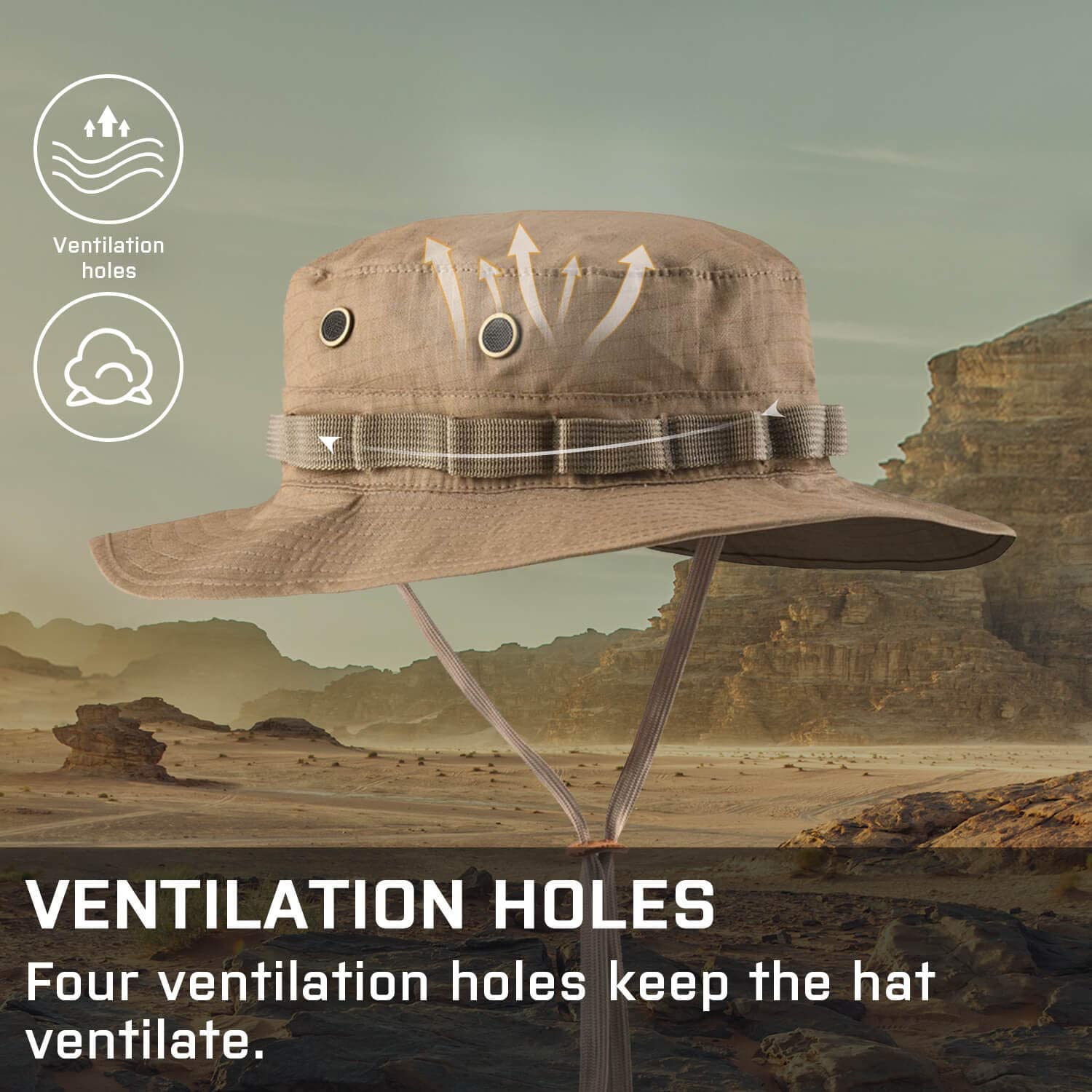 - 【3】Adjustable Chin Drawstring: This boonie hat is equipped with an adjustable chin drawstring to hold the hat in place on windy days and to ensure a secure fit.