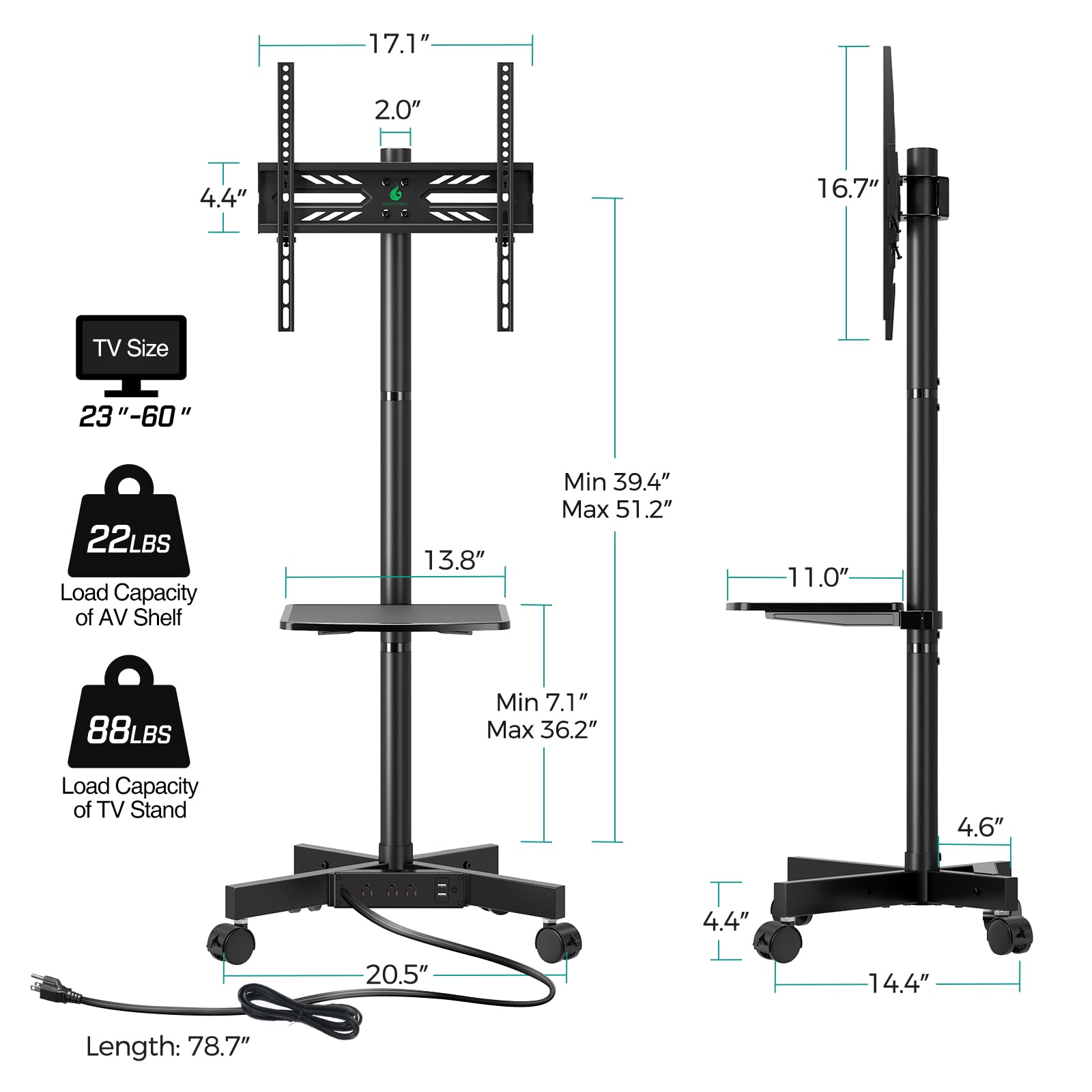 GREENSTELL TV Stand with Power Outlet, Mobile TV Cart on Wheels for 23-60 inch LED LCD Flat Curved Panel Screen TVs, up to 88 lbs, Height Adjustable Rolling TV Stand with AV Shelf, Max VESA 400x400mm
