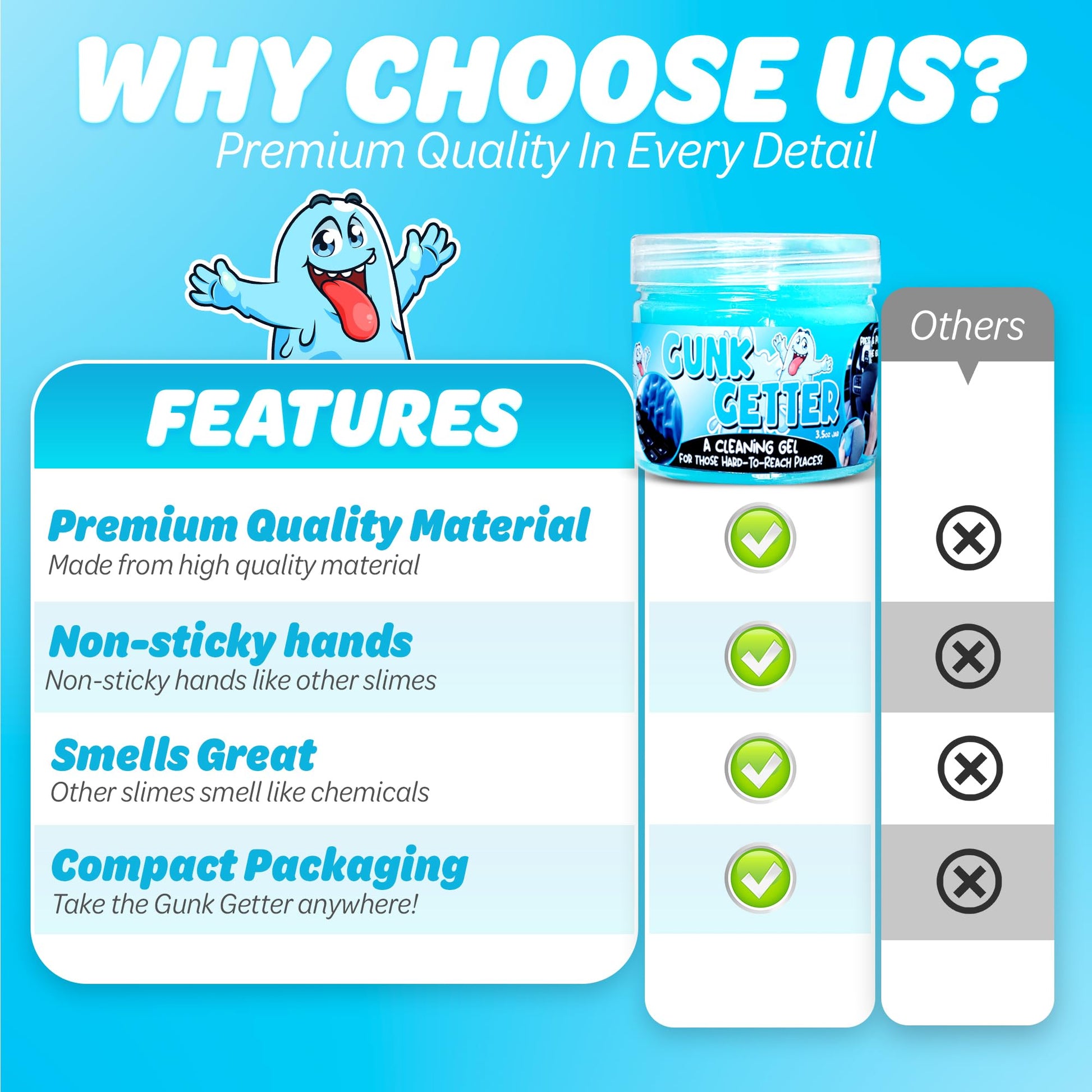 Details: 12 PACK! Share with friends and family! or be ready to get gunk all year long! KISS THOSE CRUMBS GOODBYE! - The Gunk Getter is leading brand of gunk getting cleaning gels. Dust, crumbs, and gunk are no match for the Gunk Getter! UNLIKE OTHER GELS - Incredible pick up slime that gets those pesky crumbs and dust. Dirty cup holders? Gunk Getter gets it. Dusty Vests and Dashboard? Ew! Gunk Getter Gets It. Pesky dust in hard to reach places? Pick those suckers up with EASE. NO OTHER GETTER LIKE THE GUNK GETTER - Formulated to pick up gunk, NOT stick to your hands! We tried other slimes that left our hands sticky or discolored. WE FIXED THAT WITH THE GUNK GETTER. SMELLS GREAT - Other slimes smell like chemicals. The Gunk Getter is scented. OoOoOh YeAahH! REUSABLE COMPACT PACKAGING - Take the Gunk Getter anywhere! No more huge jars that don’t travel. Having a compact storage pack!