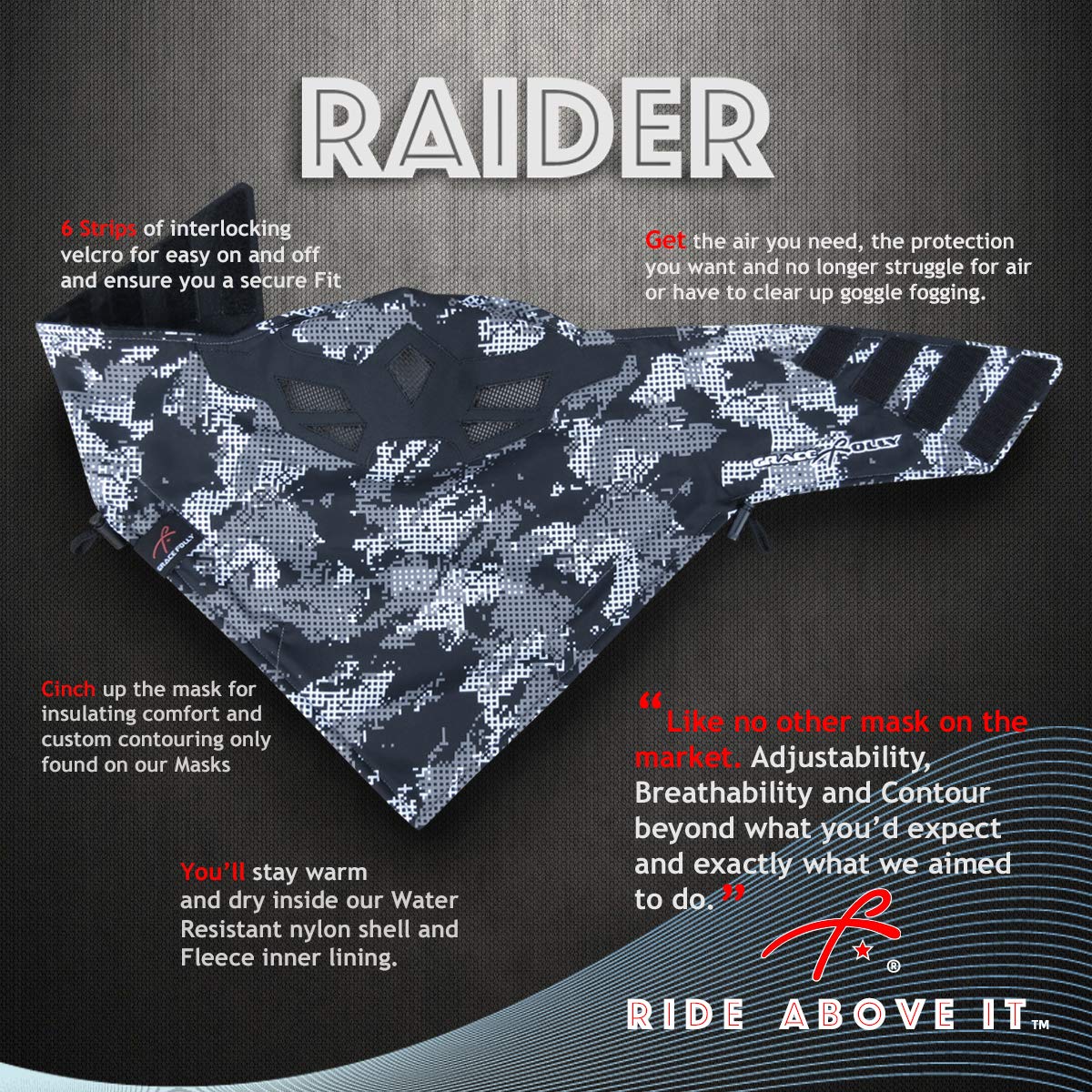 CUSTOM FIT- Innovative pull straps on the sides that cinch up the mask for a perfectly contoured fit around your face neck. 6 strips of interlocking Velcro ensure easy on and off and a secure fit. Added comfort with our contoured nose piece that will snugly keep the mask in place.