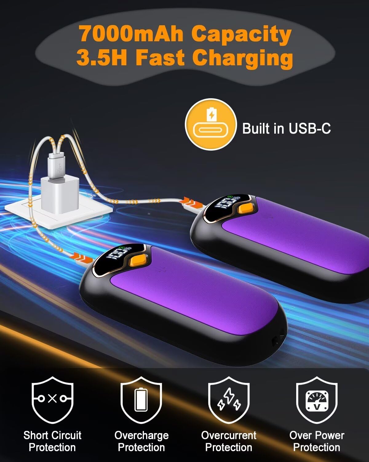 - 【7000 mAh Battery for Long-Lasting】Electric hand warmers rechargeable included Usb-C cable can charge 2 hand wamrmers simultaneously. Full charge only takes 3.5 hours, and provides you with up to 6-20 hours of warmth. This means outdoor enthusiasts can embark on long hikes,camping trips or fishing expeditions with confidence.Say goodbye to the hassle of frequent charging and stay warm all day long
