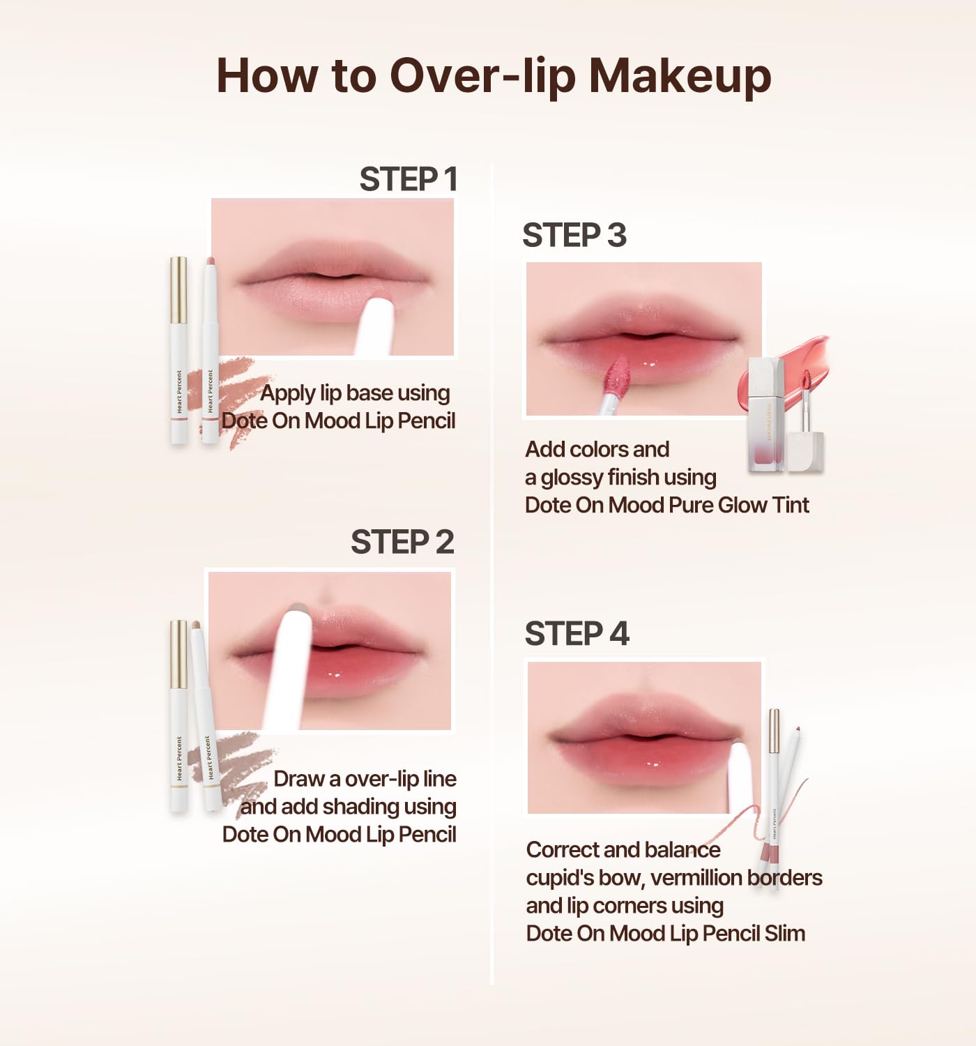 - [How to Over-lip] Assess the areas you want to contour. (add volume, fix the symmetry, improve the shape, etc.) Draw an 'X' on your cupid’s bow to create the arch, then line down the bottom center of your lip. Connect it at the corners to create a full lip line; if you over-line a little bit, go slow and build up. Fill in the lip stencil with Dote On Mood Lip Pencil or Lip Pencil Slim. If desired, add a touch of lip gloss for a glossy finish and added dimension with Pure Glow Tint.