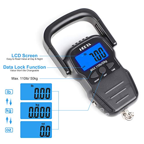 HEETA Fish Scale with Backlit LCD Display, Up to 110lb/50kg Digital Portable Hanging Fish Weight Scale with Hook & Measuring Tape for Home, Farm, Outdoor, Hunting, Fishing, 2 AAA Batteries Included