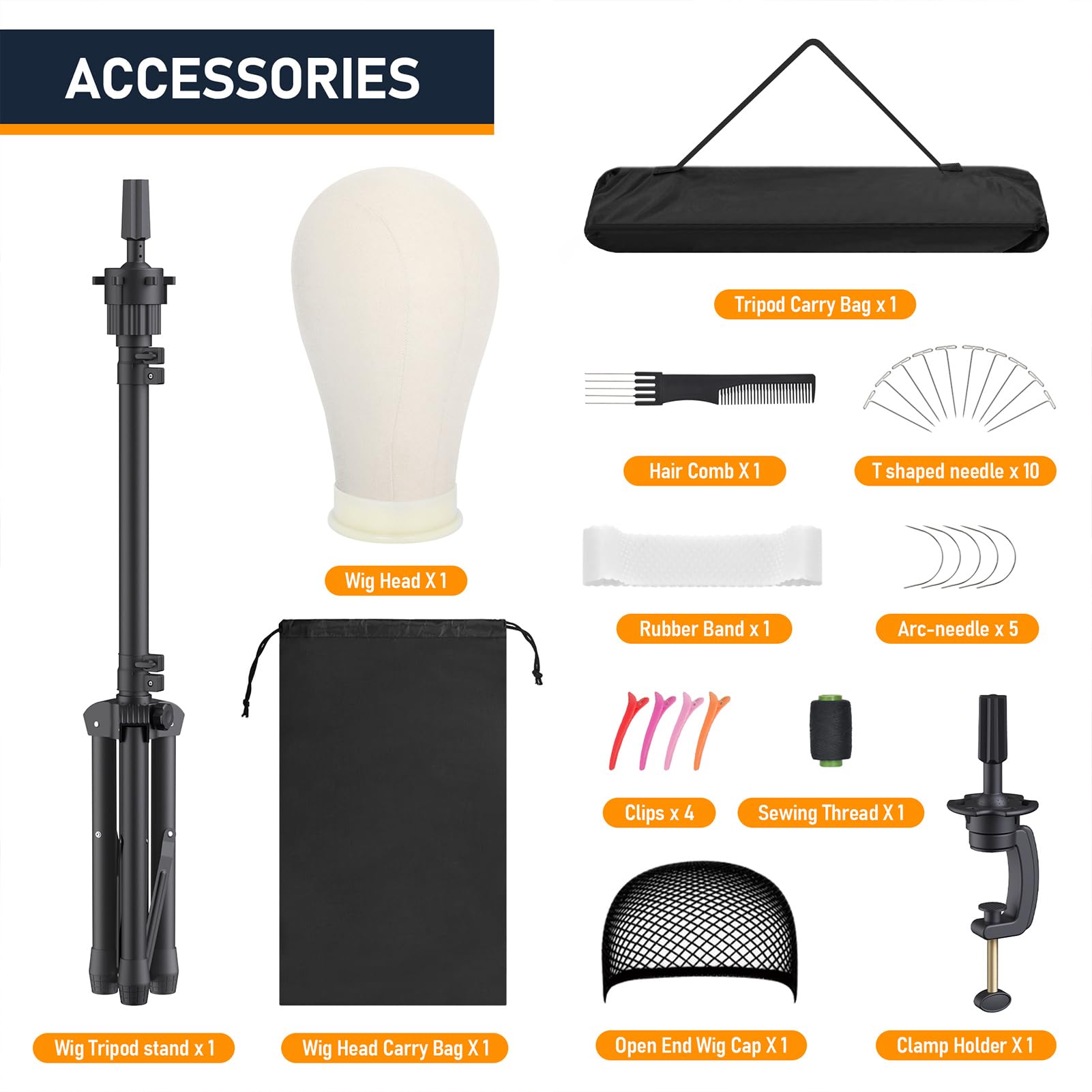 - 【Contain】Wig head stand set includes canvas head, tabletop tripod, wig cap, t-pin set, non-slip strap and hair brush. Fully functional, it with all accessories you need to adjust wigs.