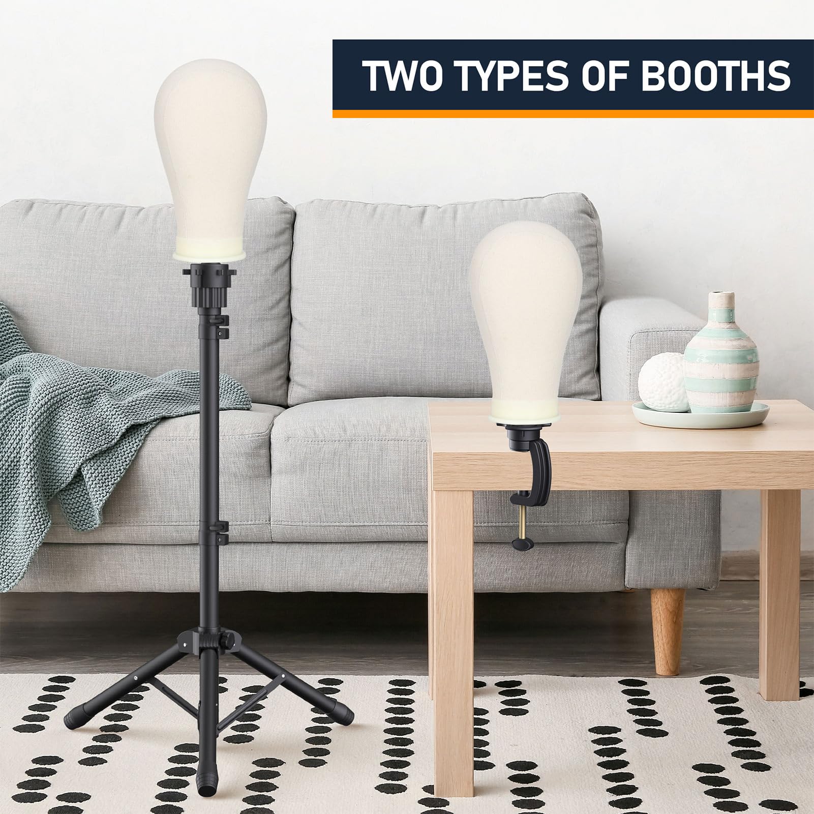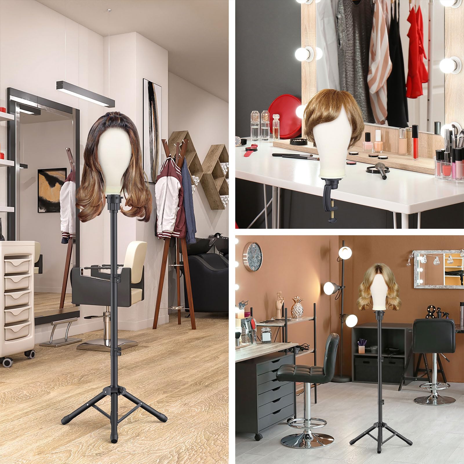 - 【Dual-purpose】The wig head stand Set includes a floor wig stand tripod and table clips, so you can make and display your wigs on tabletop or floor.