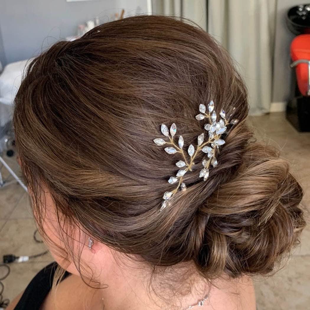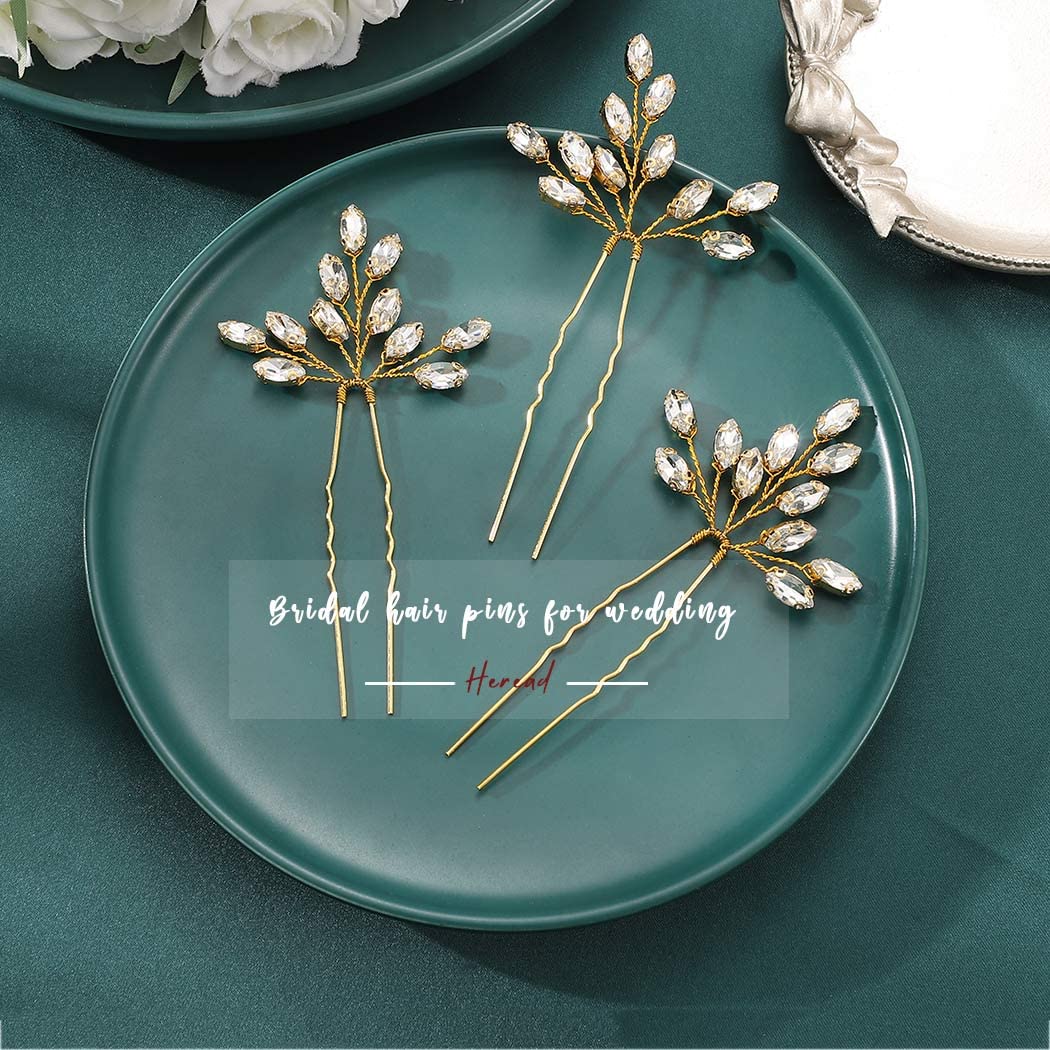 Heread Crystal Bride Wedding Hair Pins Rhinstones Bridal Hair Accessories Head Piece for Women and Girls (Pack of 3) (C Gold)