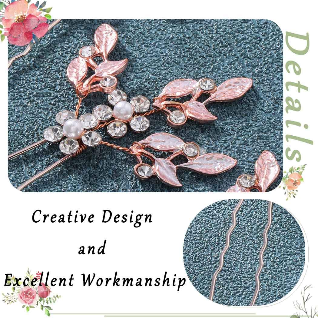 Heread Leaf Bride Wedding Hair Pins Crystal Bridal Head Dress Pearl Hair Accessories for Women and Girls (Pack of 3) (A Rose Gold)