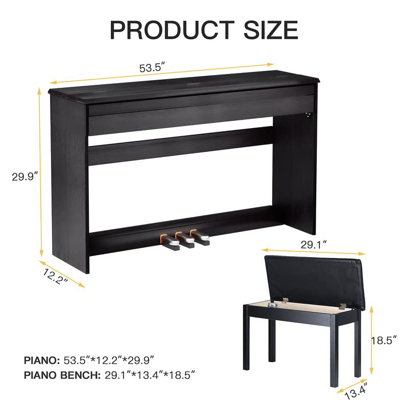 - Piano Size—53.5x29.9x12.2 IN, Bench Size—29x18.5x13.4 IN. Package contain: 1x Piano, 1x Piano Bench, 1x 3-pedal, 1x Adapter, 1x Installment.