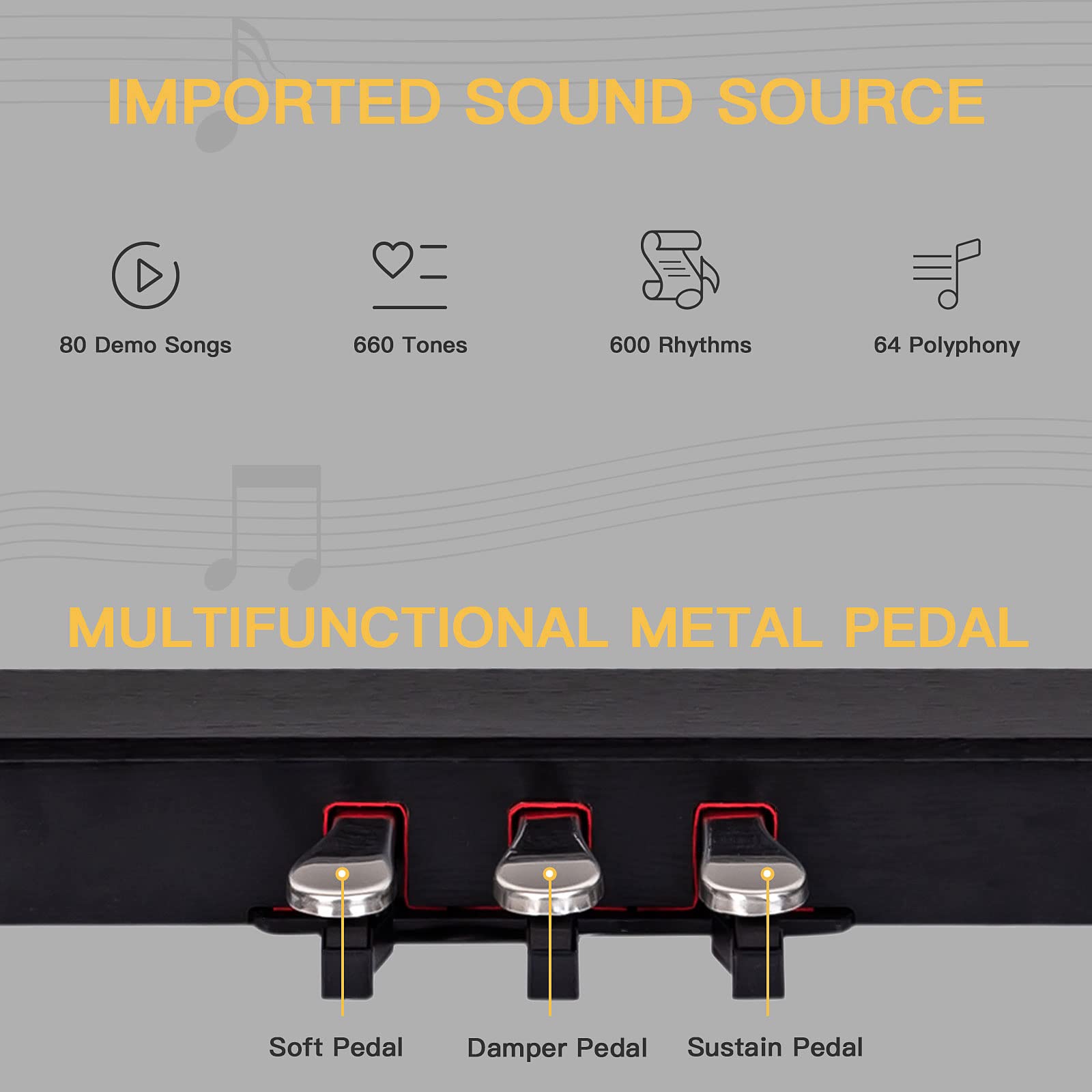 - 【Built-in Premium Voice】Built-in premium voices/ 80 demo songs/480 tones/128 standard GM tones/200 present rhythms/64 Polyphony, bringing you richer and better experience of practice and performance.