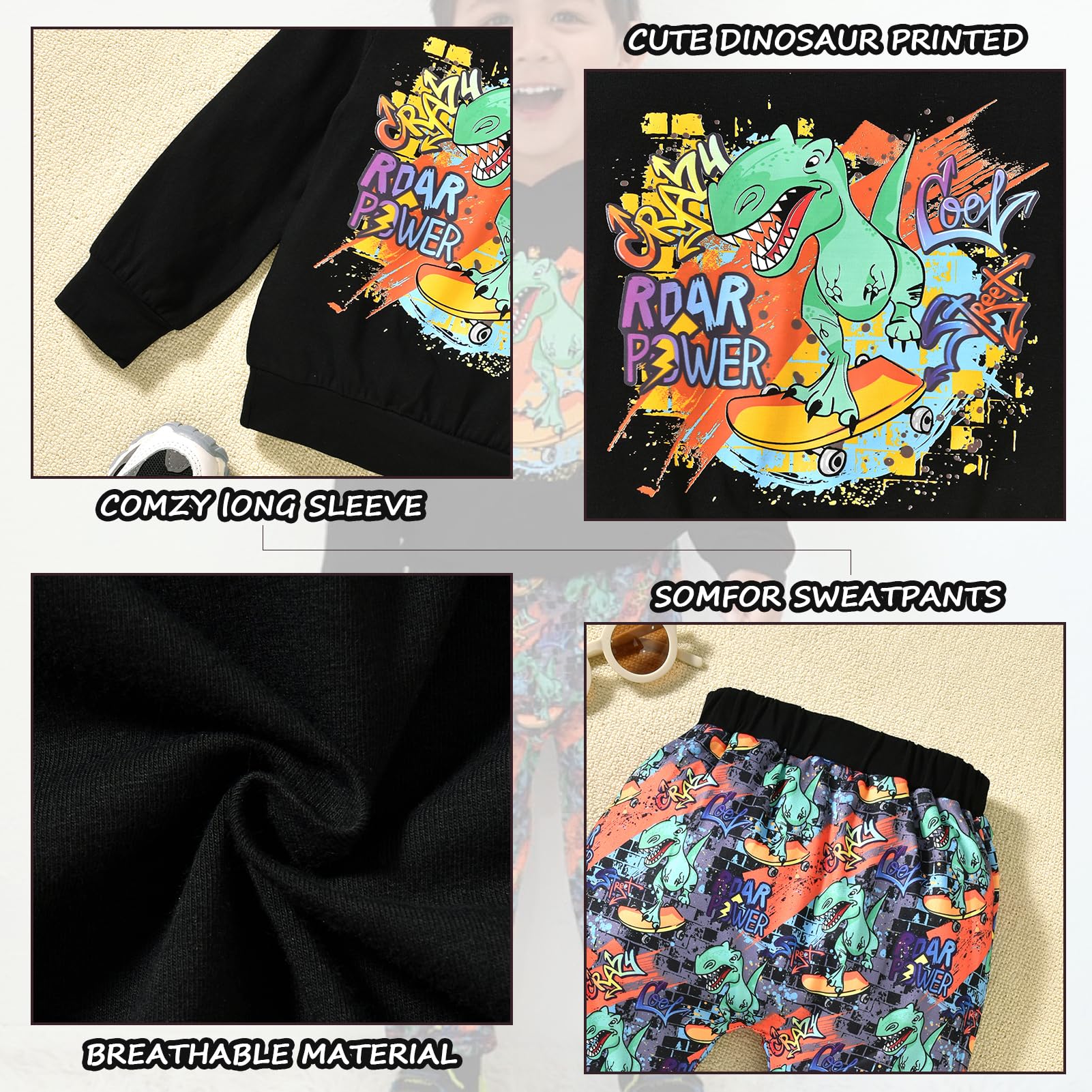- 🦖UNIQUE DESIGN: Toddler little Boy 2-piece clothes set features a long sleeve crew neck pullover hooded sweatsuit top with stylish dinosaur printing, cute dino jogger set, matching elastic waistband sweatpants for a complete outfit. The adorable t-rex pattern adds a touch of fashion to your little one's look and is perfect for everyday wear, casual occasions, and even sports activities.