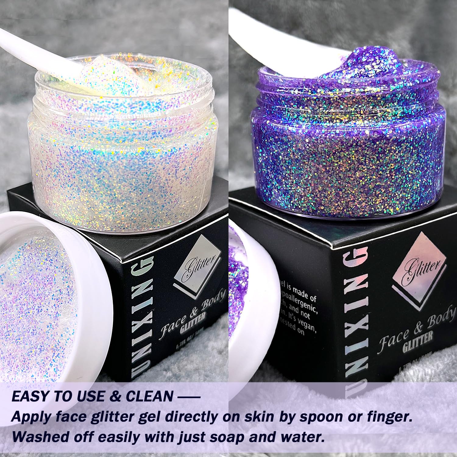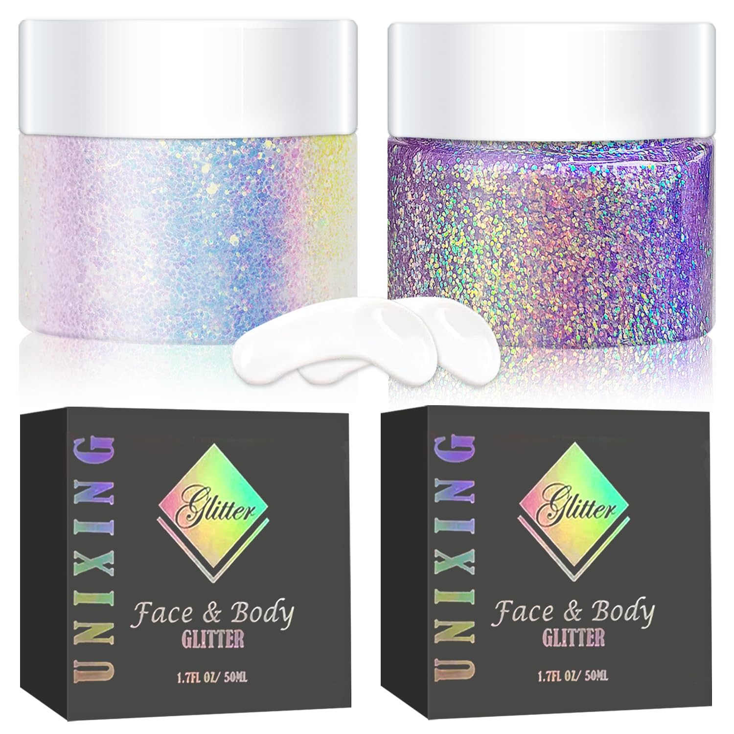 - Cosmetic-Grade Glitter Gel: Unixing holographi face and body glitter gel is made of high-quality, safe and non irritating cosmetic-grade materials. It is Vegan & Cruelty Free. the glitter is bright and color changing under light. Package contains 2 jars of body glitter gel. Each bottle contains 1.7 Oz/50ml.Color:Golden Ocean + Purple chameleon Glitter Gel