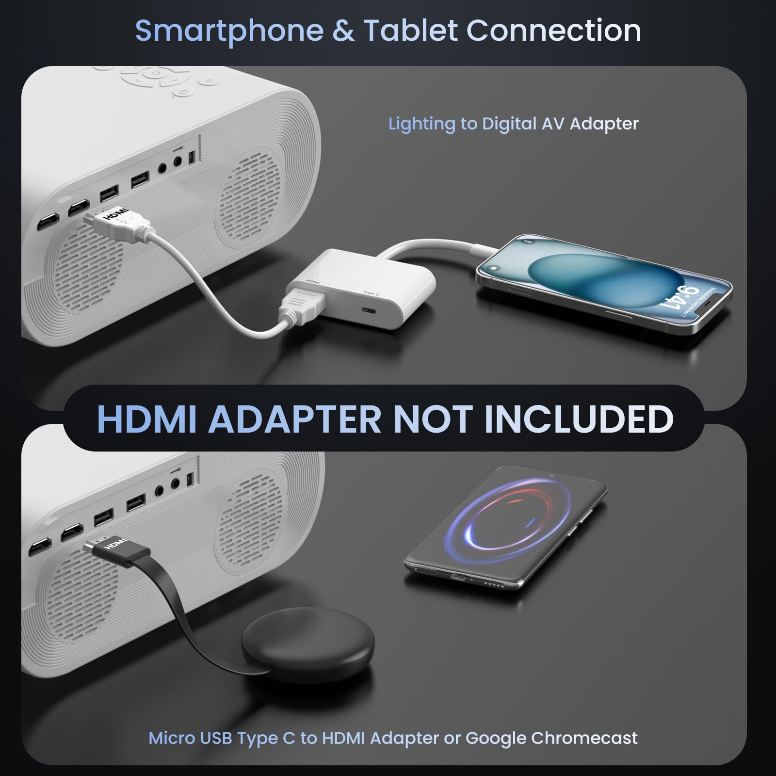 - 【Phone Projector with Wide Compatibility】:Equipped with HDMI, AV, USB, 3.5mm headphone interface, the smart projector is compatible with TV Box, TV Stick, Laptops, Tablets, USB Flash Drive, etc. it's compairble to multiple devices to meet most daily home theater requirements—Home Theater, Video Game, Party, Apartment