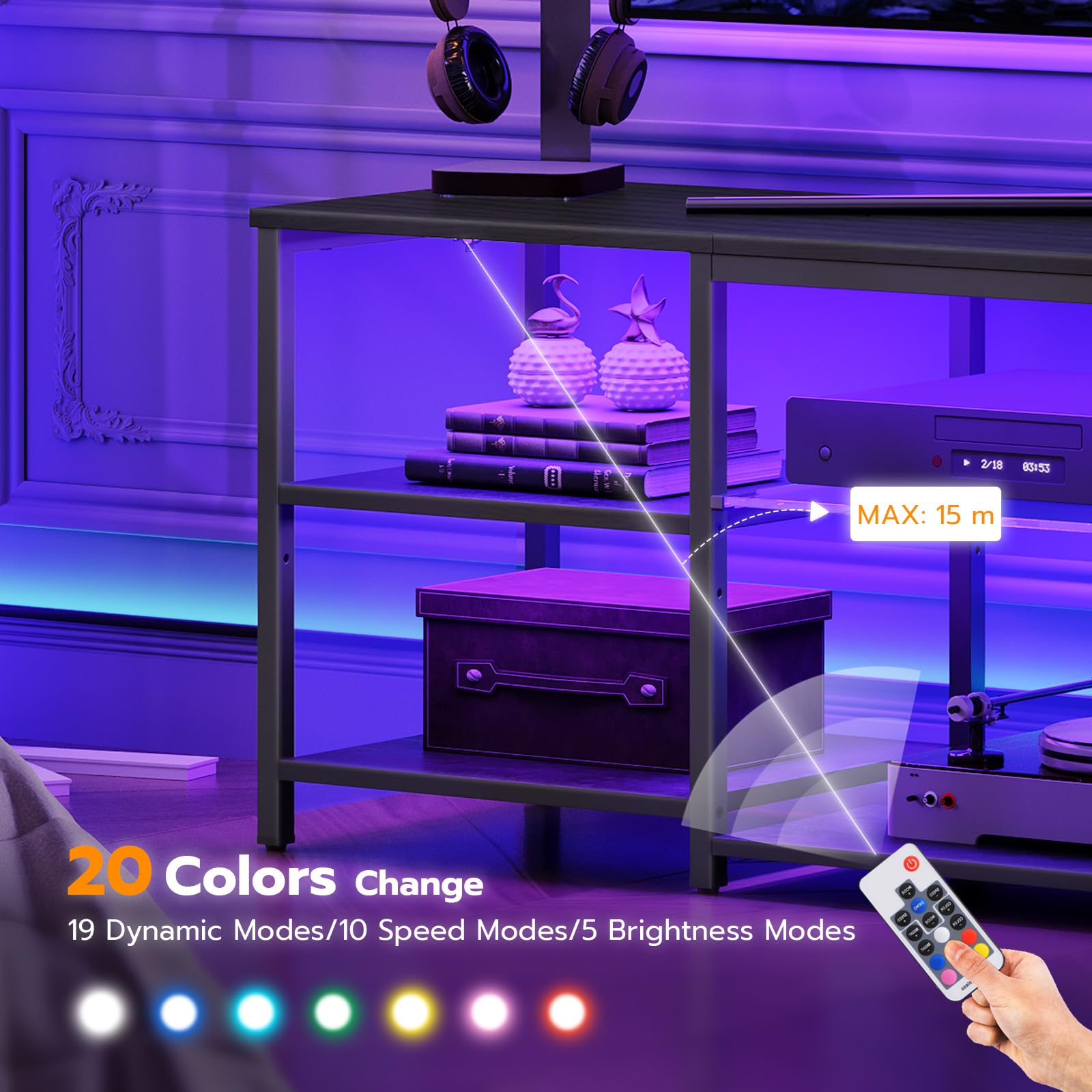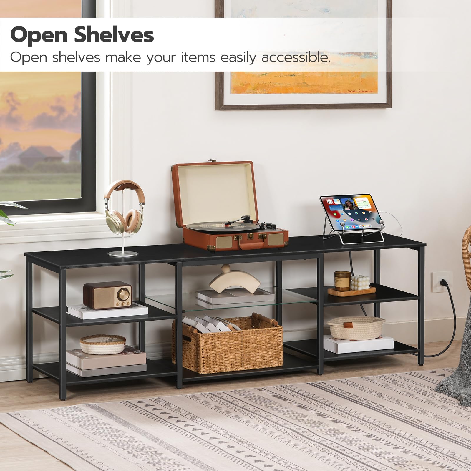 - Clever Storage: This television stand is 55.1'L x 15'W x 19.7'H and can accommodate TVs up to 65 inches. With 3 open shelves, it provides ample space, and the middle shelves on both sides are adjustable to 2 different heights, catering to various storage needs