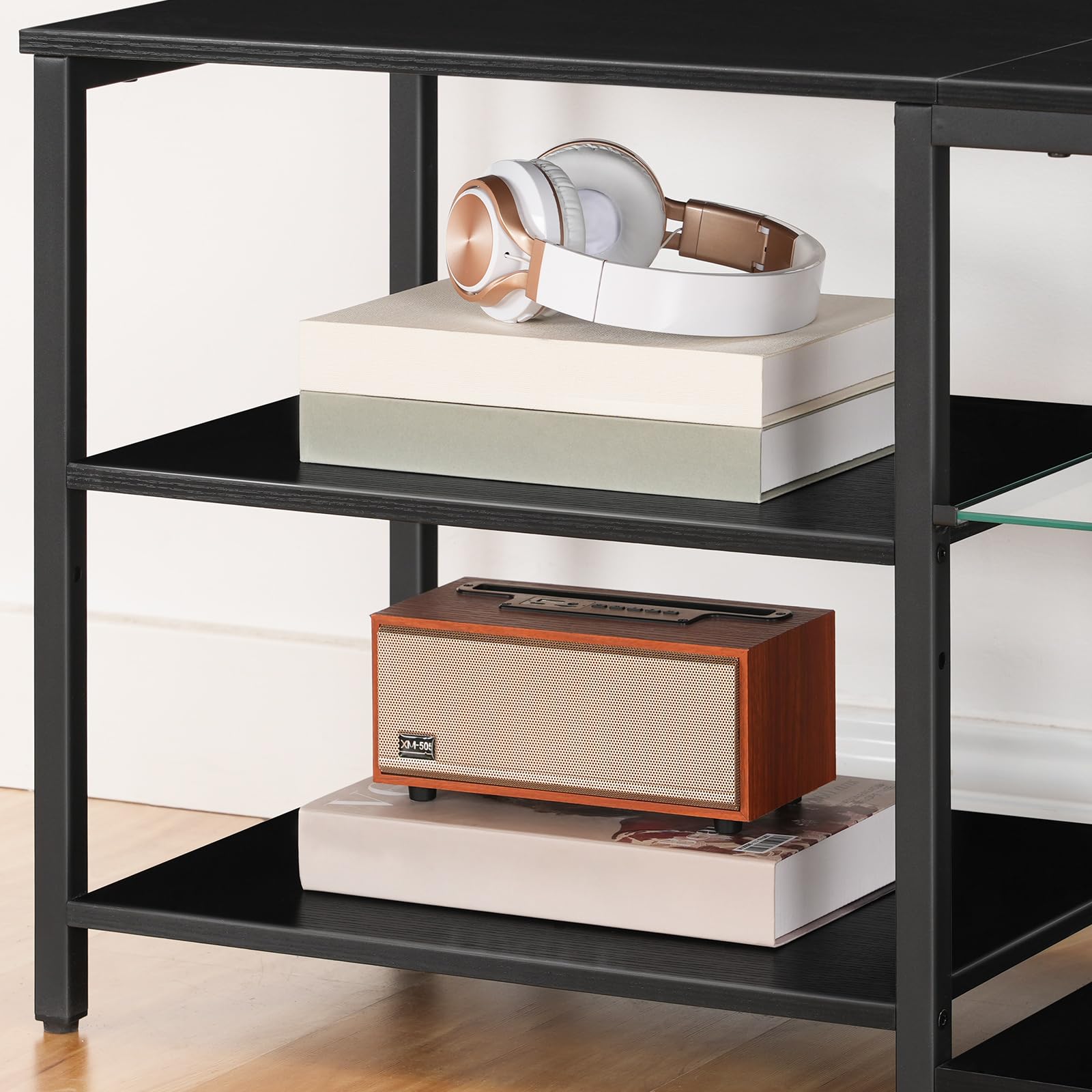 - Modern and Minimalist: The TV console table has a sleek and minimalist design, with a black body and accentuated by a glass panel, exuding sophistication and elegance. It can serve as a focal point in the living room or a private space