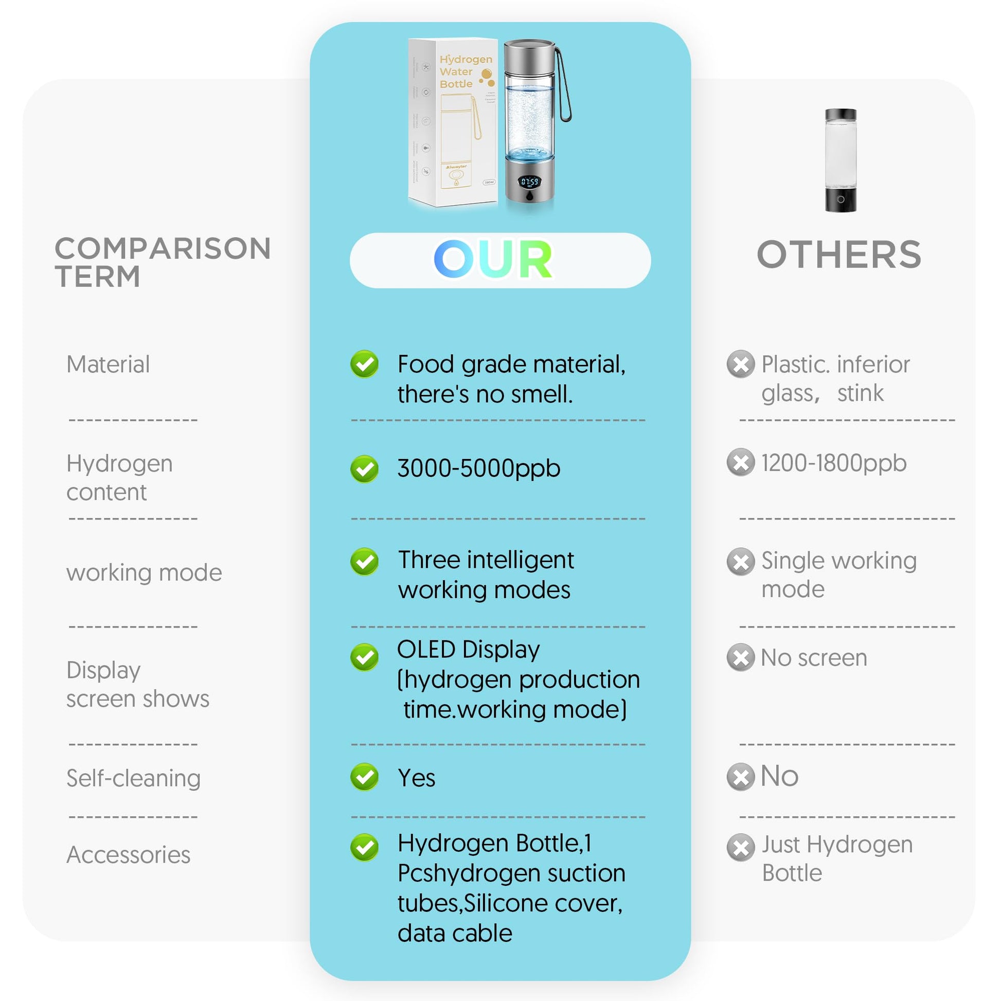 - Your Key to a Healthier Lifestyle:Hydrogen-rich water is known for its antioxidant properties, helping to reduce inflammation, boost energy, and improve overall well-being. With our hydrogen water bottle, you can enjoy these benefits anytime, anywhere. Make it a part of your daily routine and take a step toward a healthier, more vibrant life!
